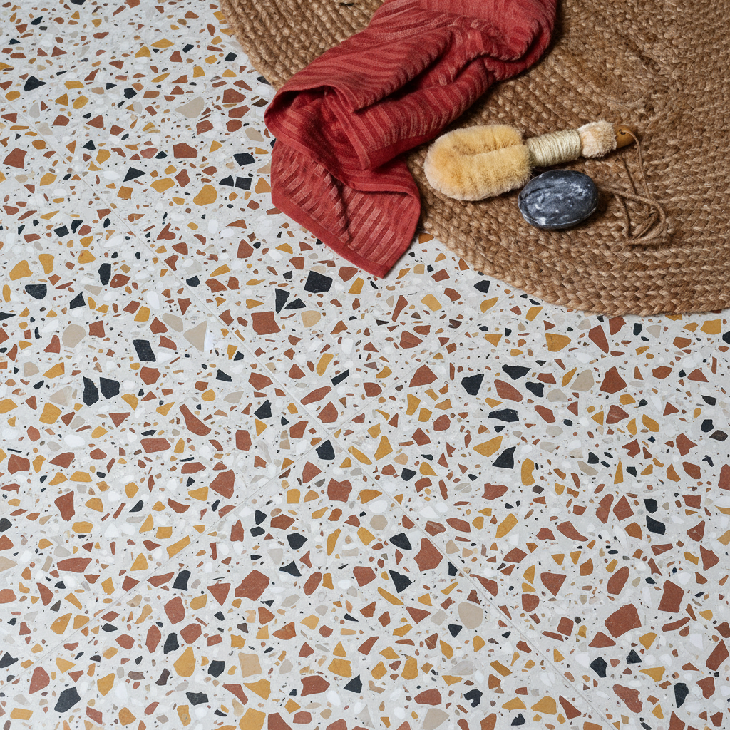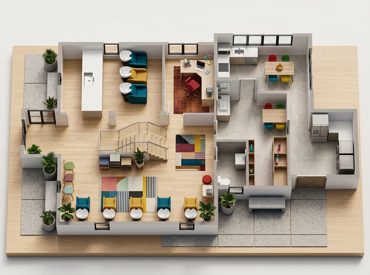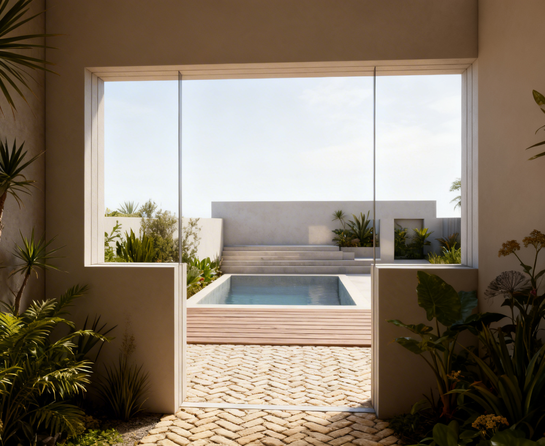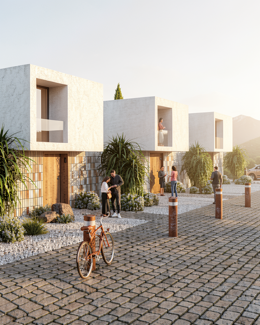 image type hyper realistic architectural render of a contemporary residential development in a mediterranean setting scene framing street level view in oblique perspective showing a row of cubic housing units cobblestone pavement and urban elements in the foreground elements cubic houses with light stucco texture and wooden joinery mediterranean landscaping xerophytic plants gravel low shrubs people interacting near a house entrance bicycle placed in the foreground cylindrical bollards aligned along the street edge key modification reduce the scale of the bollards to 40 50 of their current size realistic height 70 90 cm proportional diameter 10 15 cm adjust their presence so they read as secondary elements not dominant features maintain original spacing and alignment preserve materiality weathered metal corten steel but with reduced visual weight lighting warm late afternoon sunlight soft elongated shadows slightly hazy atmosphere color textures warm slightly desaturated palette with earth tones off whites and soft greens realistic materials with subtle natural aging style contemporary mediterranean architecture editorial architectural visualization balanced realism with atmospheric quality quality high resolution fine material detail subtle depth of field constraints do not alter building proportions or pavement geometry do not change camera position do not add or remove elements only correct bollard scale avoid any global miniaturization effect