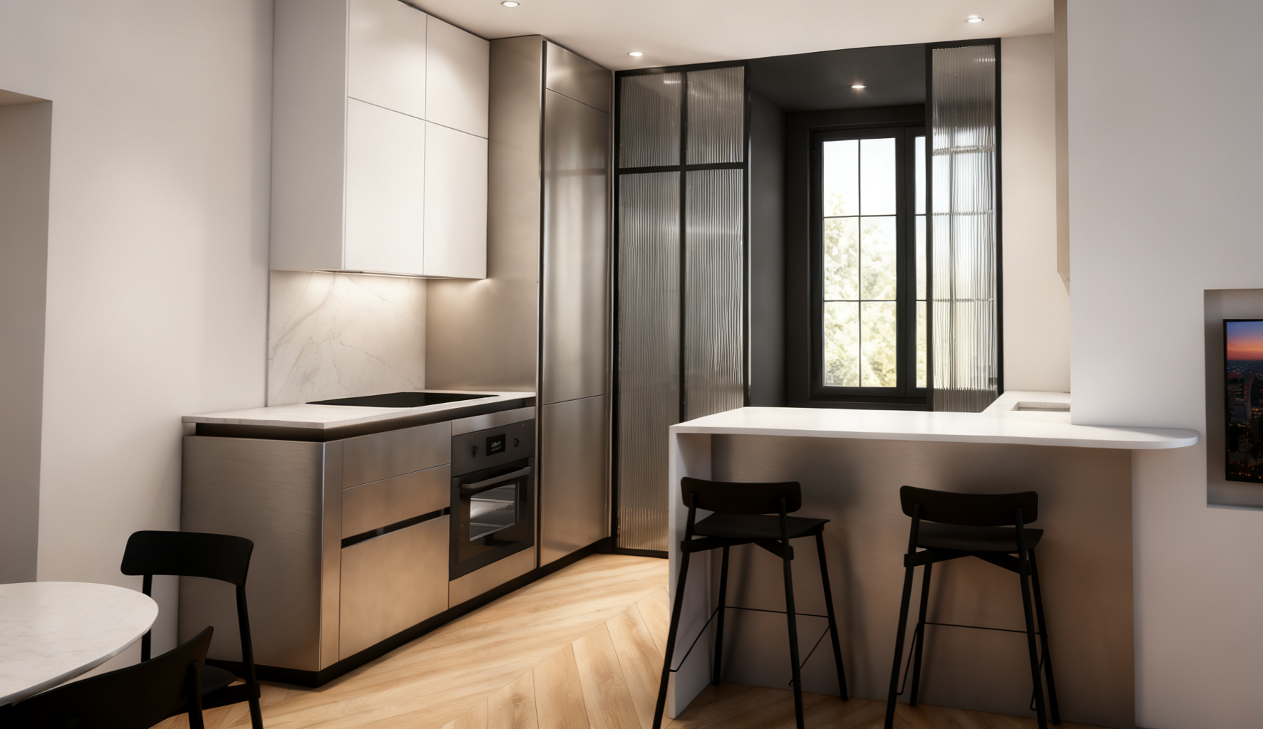 ajoute de la d coration et de la vaisselle sur le plan de travail ajoute de la d coration sur le mur au dessus de l ilot et un tabouret devant
