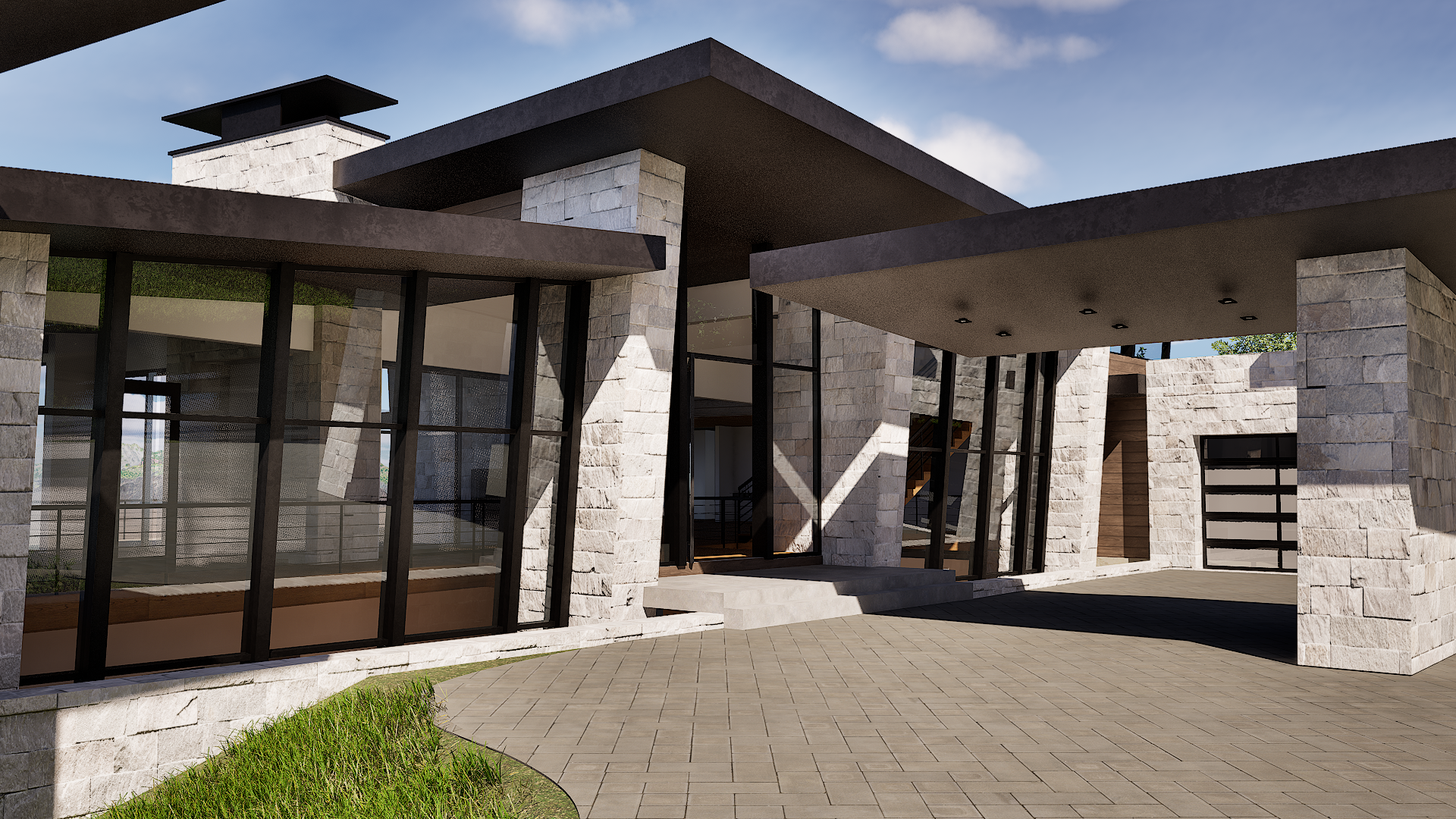 don t change the structure a modern home made from the following materials white stacked stone veneer dull black aluminum acm metal paneling horizontal brown wood siding and a black aluminum metal fascia enhance each of these materials to have more realistic shadows and textures add a dull warm light illuminating from the interior add minimal landscaping and vegetation on the left part of the image
