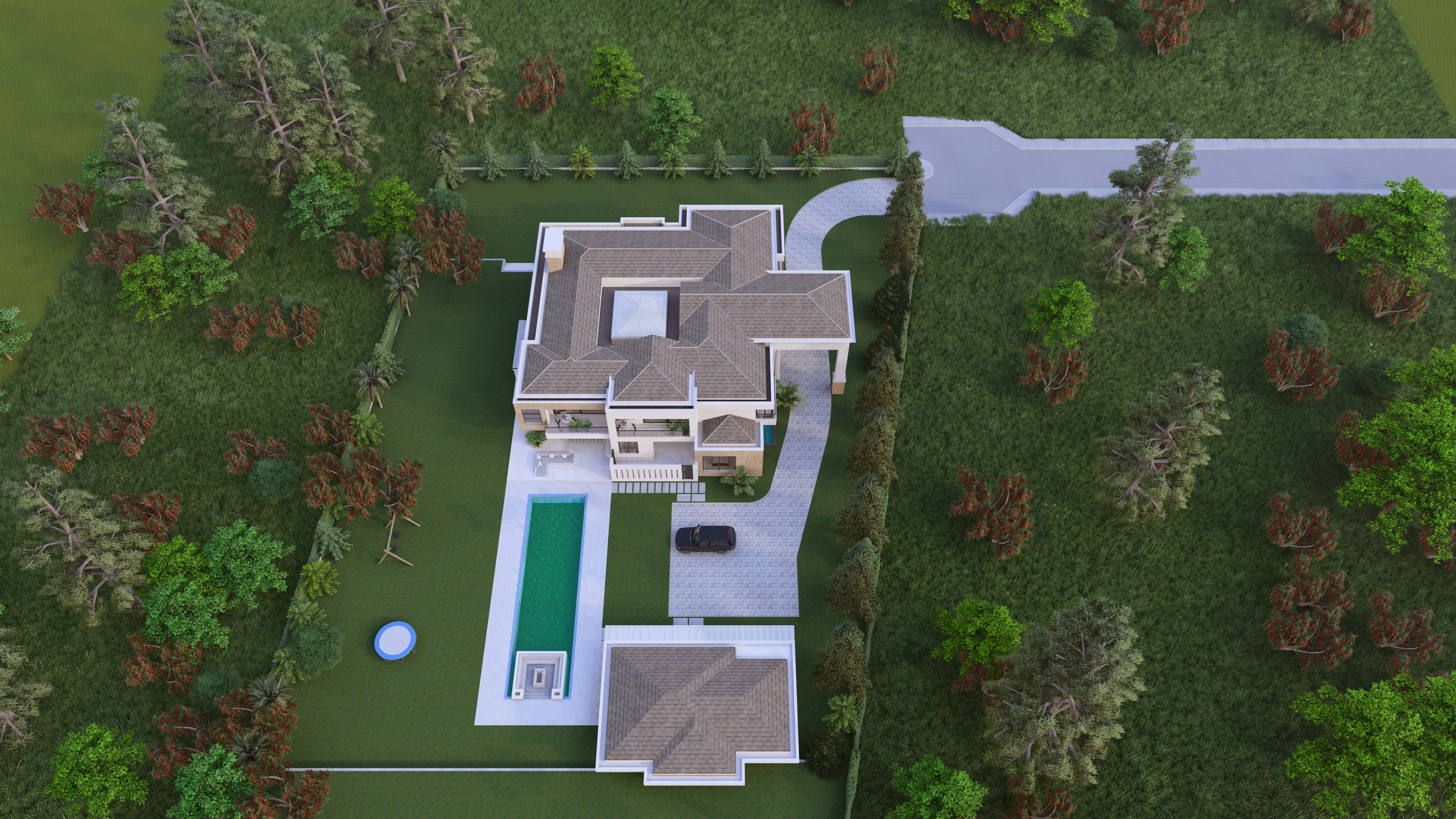 modern two story house with a minimalist design featuring large glass windows and crisp white walls the lush green lawn covers the foreground with tall trees in the background a bright blue sky with light fluffy clouds add vibrant red flowers on the left with additional potted plants near the house the atmosphere is serene and inviting with a focus on natural light and calmness using contrasting elements to enhance the architectural details ensure you maintain the angk le of the picture as it is no changes on the angles please