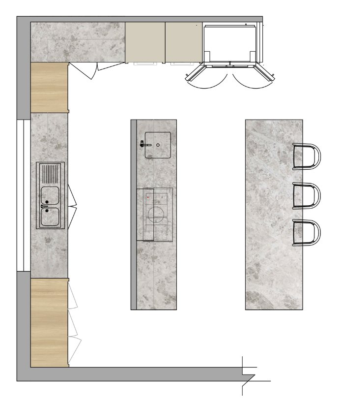 create a floor plan visualisation of the kitchen include a pale herringbone timber floor