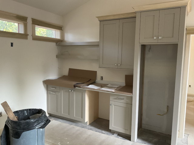 do not change the cabinets in any way preserve the exact cabinet colors materials finishes dimensions door and drawer styles hardware spacing alignment and all geometry exactly as shown do not alter the countertop shape backsplash appliances flooring lighting fixtures or wall structure only remove the construction materials clutter and mess from the scene clean the room and make it look finished and staged add a few simple tasteful home accessories appropriate for the style of the space but do not add or remove any furniture windows or architectural elements maintain the original lighting direction and realism enhance clarity and polish the photo while keeping the cabinetry and room design completely unchanged do not alter the lighting to keep the cabinet colors as they are in the image add a subzero stainless built in fridge in the opening add a dishwasher to the right of the sink base stage for a yoga lounge change the crown molding on the cabinets to match the white window trim