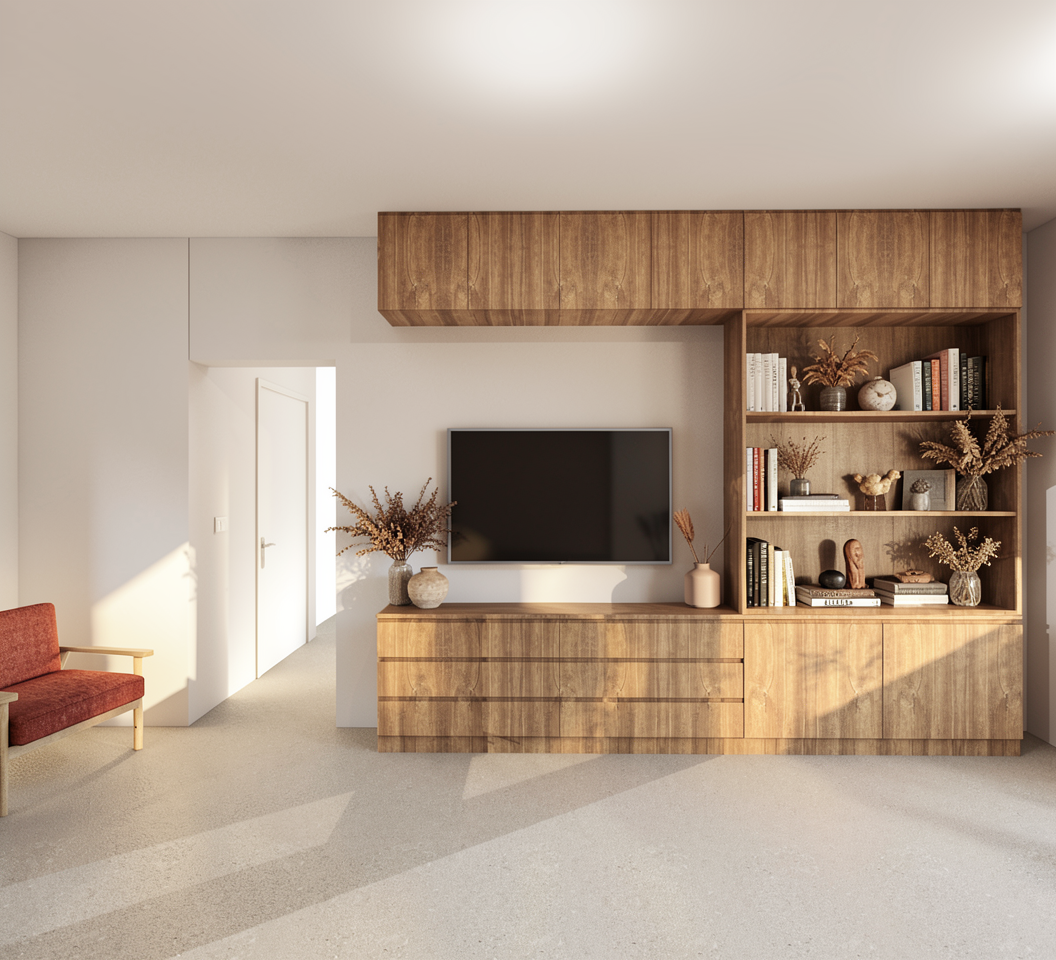 a modern inspired tv wall composition the shelving is styled with a curated mix of books dried flowers and decorative objects creatinga minimal deroration carpet and coffee table cozy wood is natural and soft