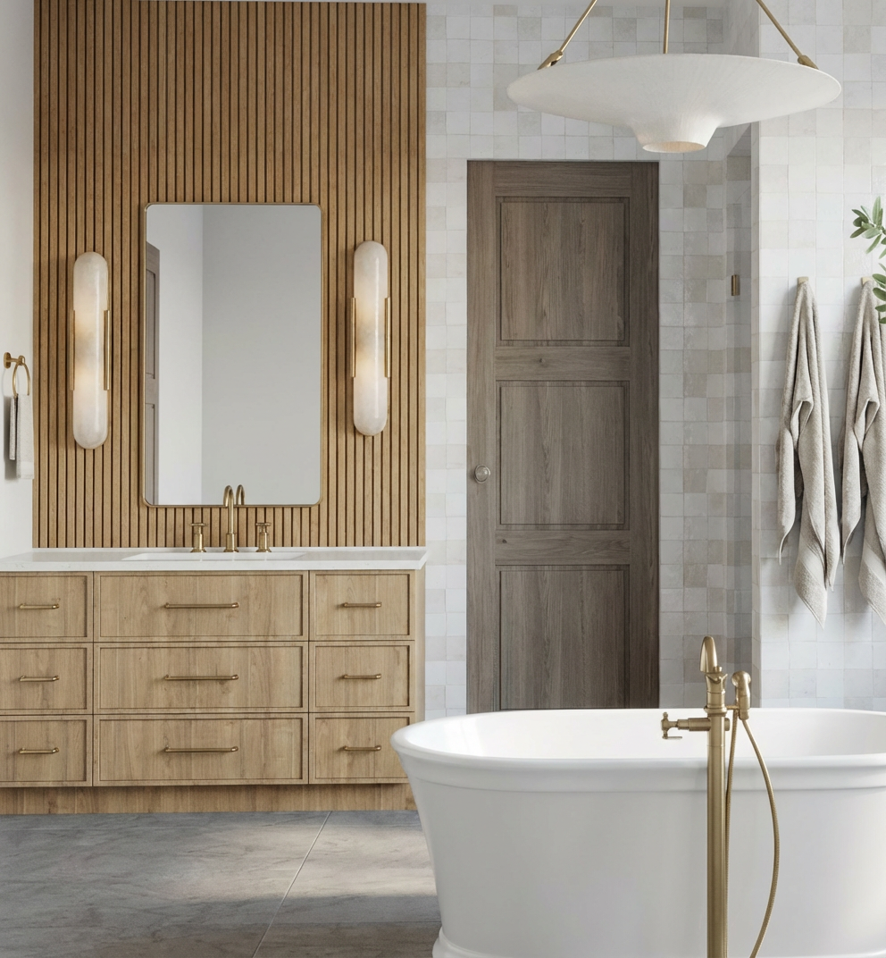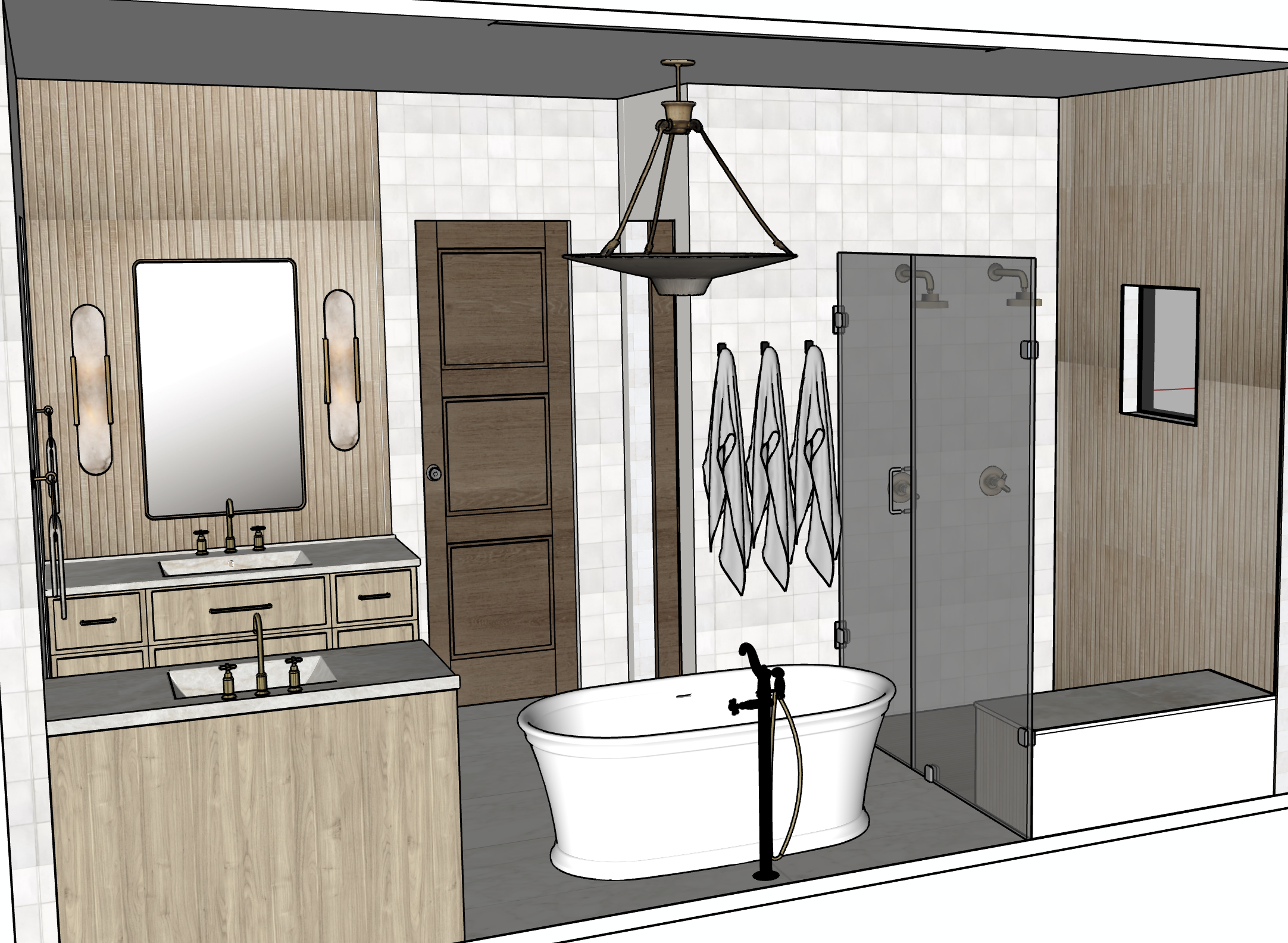 all hardware including the bathtub faucet should be brushed brass turn lights off and fill the space with natural light coming from the angle of the viewer