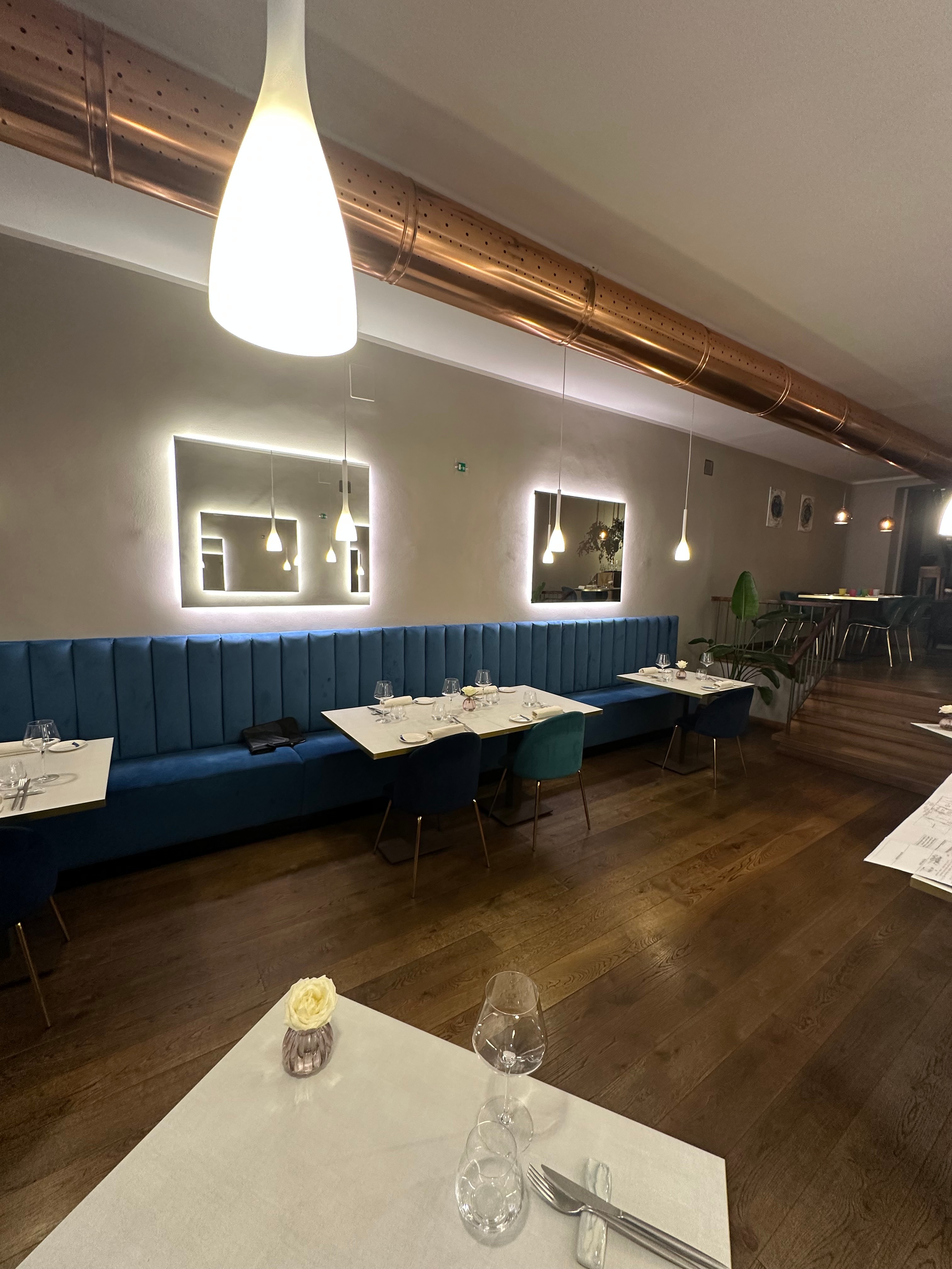 photorealistic neutral interior render preserve the existing space exactly same architecture same proportions same camera position same floor material and reflections same ceiling height same exposed metal duct preserve the long continuous blue banquette sofa along the wall preserve all dining tables in the same position and quantity with bare tabletops and no table styling remove all decorative elements no mirrors no wall sconces no pendant lights no ceiling lights no chairs no loose furniture no artwork no plants walls must be plain continuous plaster clean and neutral without any objects empty minimal neutral architectural interior clean lighting realistic shadows professional architectural photography do not add any new elements do not redesign the space