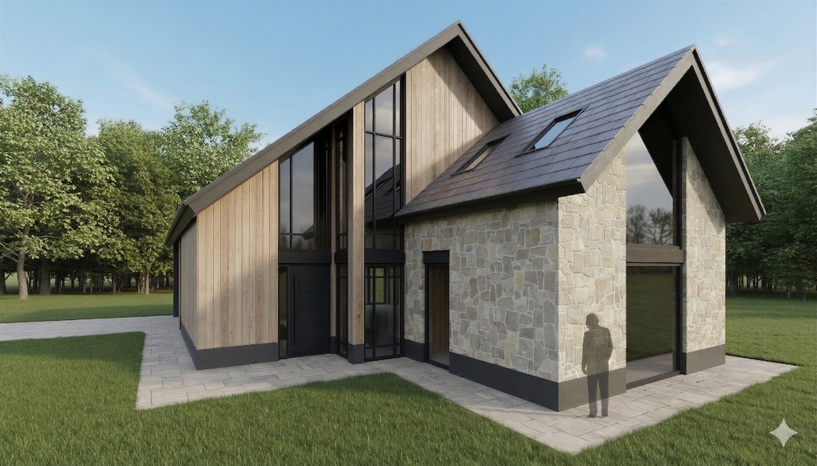 to the right of the house a hedge is allowed on the plot boundary with some small trees behind it on the left is a fully driveway with large gravel a paved section some plants and a hedge that screens the area behind the house