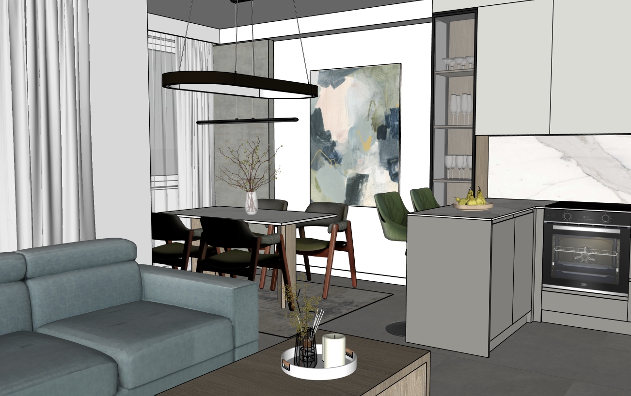 make photo realistic keep colors textures and materials don t change anything slab of dinning table white marble only upper kitchen elements are beige open shelve with glasses are wooden
