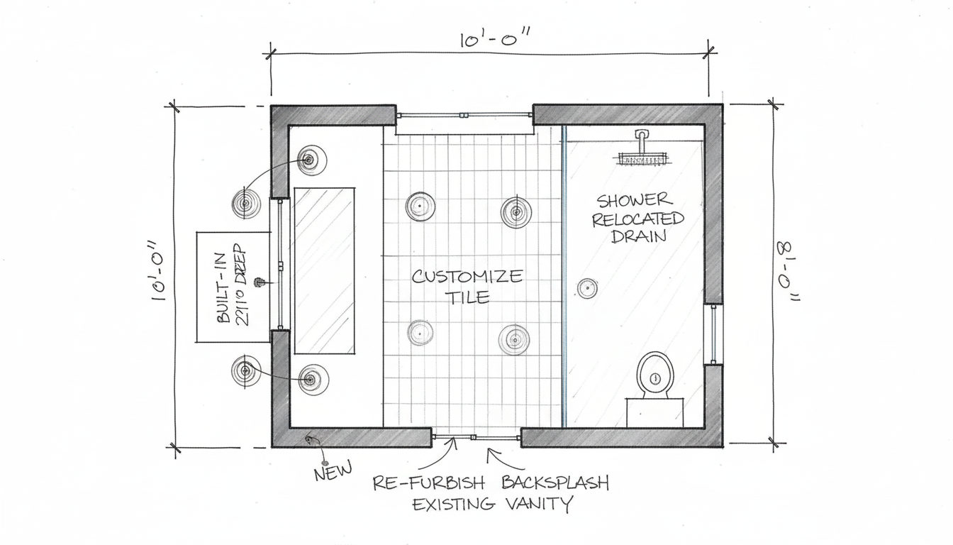take this floorplan sketch and generate into 2d floorplan tiles down center double sink vanity outside of bathroom on bottom right dressing station on other side of wall to the left of the vanity shower spans across left wall with shower drain towards top left toilet on top right behind privacy wall