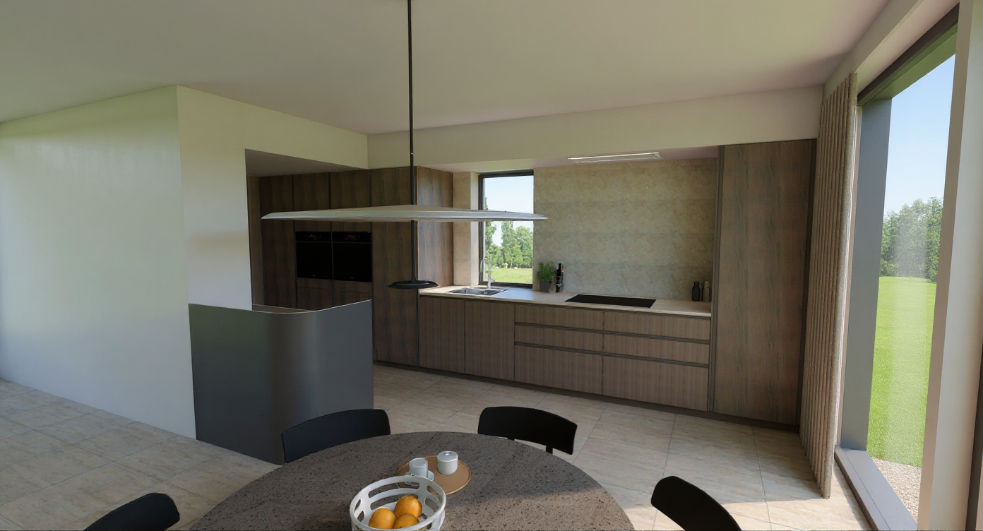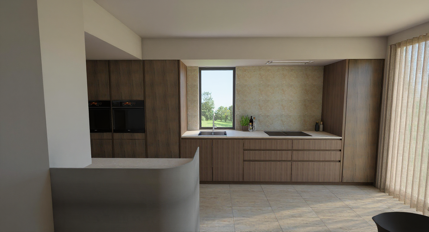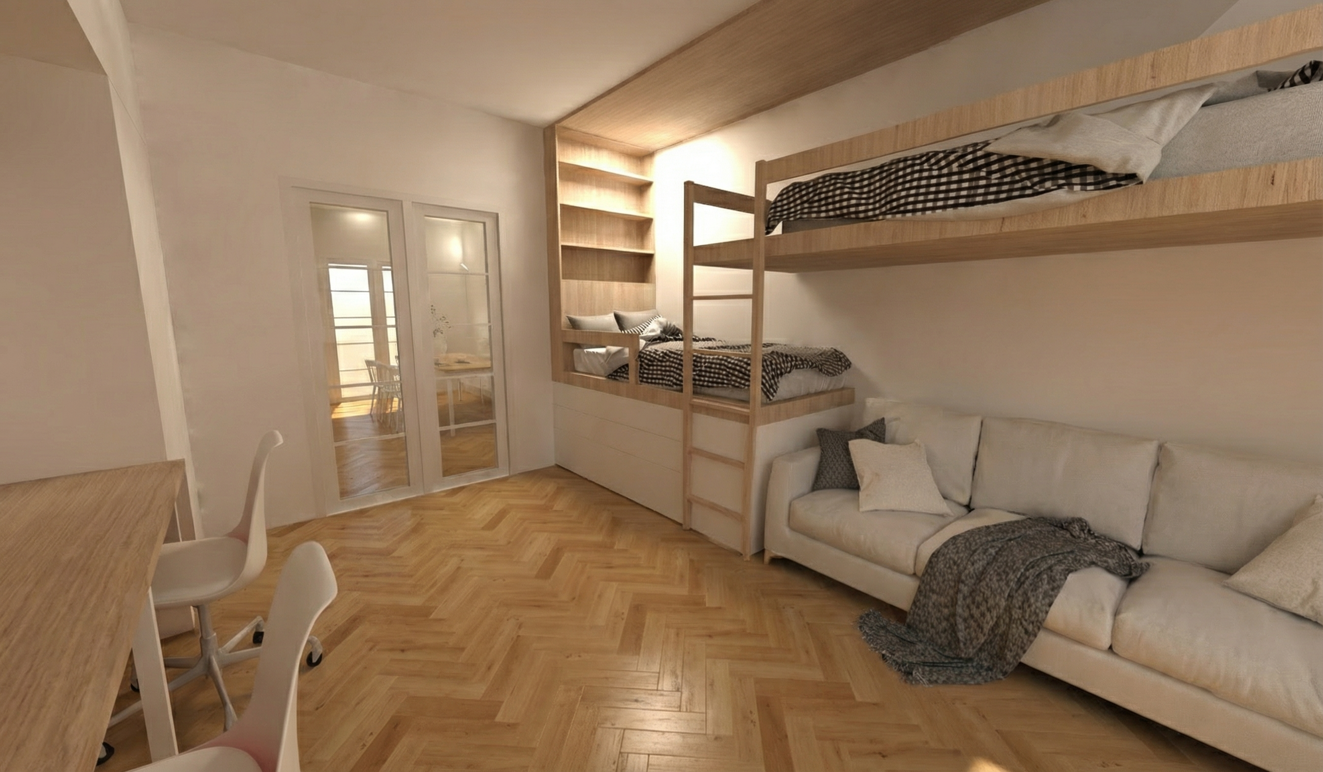 a modern bedroom with a soft calming atmosphere the wardrobe is light wood with minimal grain featuring sleek brass handles the walls are a subtle taupe blending seamlessly with the contemporary gray ceiling the floor is a warm oak tone inviting and cozy a bed with a soft white duvet is adorned with vibrant cushions in navy blue and burnt orange a textured gray throw is draped elegantly over the bed the nightstand is a muted gray complementing the shelving that holds a mix of black white and gold decorative items and books the window features stylish gray roman shades and an abstract framed artwork with colorful text we no me soft ambient lighting enhances the serene minimalist style