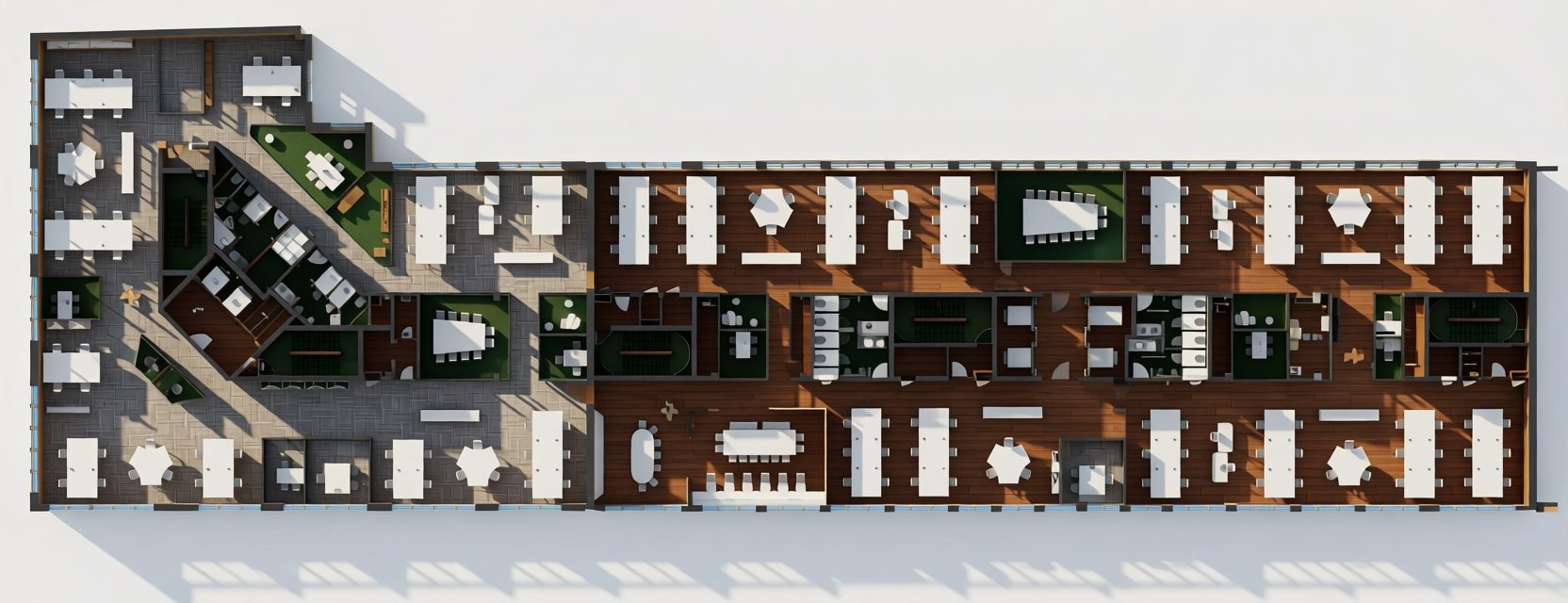 can you generate a plan with texture gray light carpet with dark soft green gradient in the closed meeting rooms and a wooden floor in the central closed room all the tables in white general bright lighting from the top not to many shadows