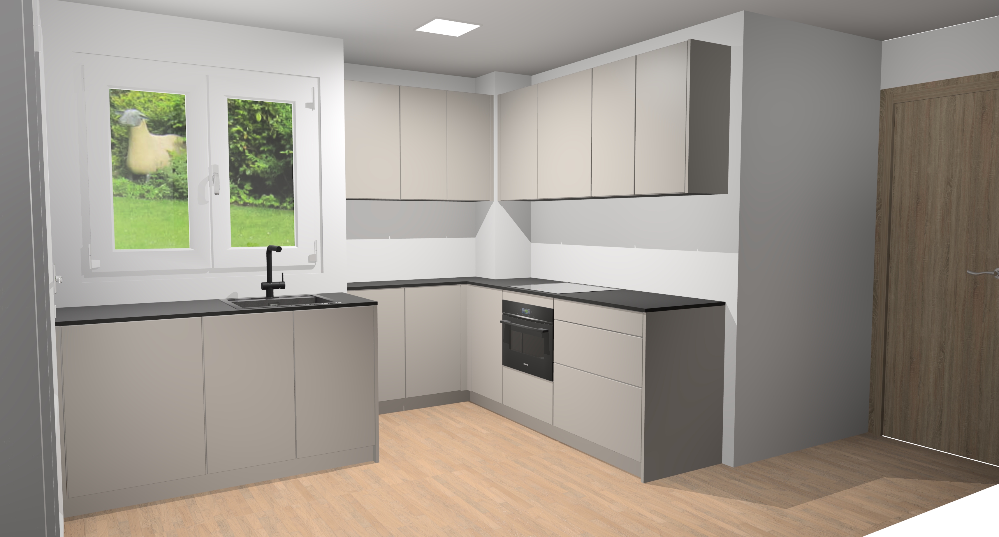 muebles color cashmere mate encimera granito negro mate fregadero negro grifo negro horno cristal negro suelo porcel nico roble medio paredes azulejo cl sico blanco peque o rectangular exterior ventana con entrada de sol a ade iluminaci n led debajo de los muebles colgantes a ade botes de cocina