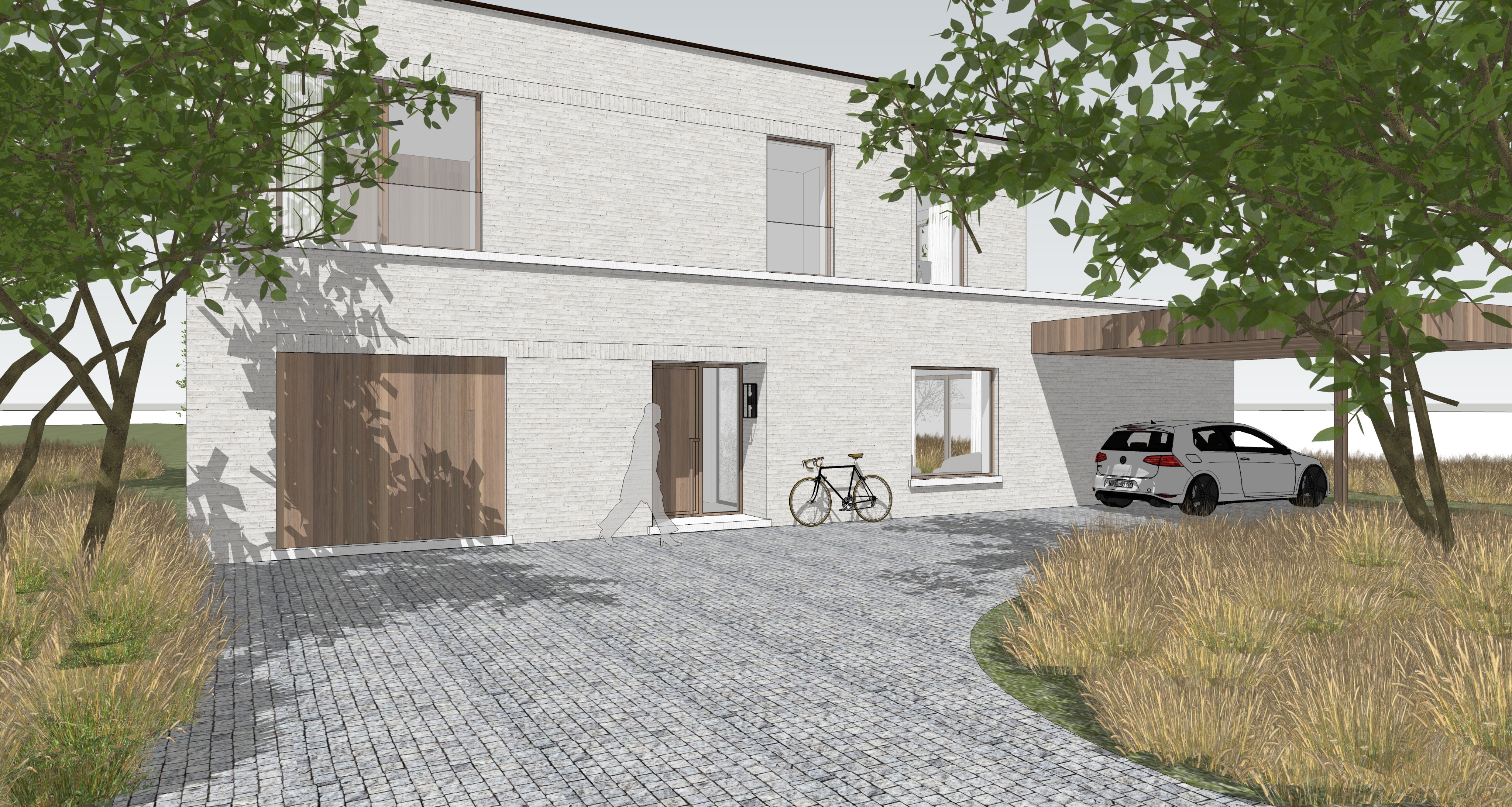 create a high end photorealistic exterior render of a contemporary single family house based strictly on the provided architectural drawings the fa ade is constructed in light grey nuanced facing bricks accurately reflecting the specified brick bonding patterns as shown in the masonry drawings ensure correct scale joint thickness and realistic brick texture variation window frames are anodized aluminum with a warm gold finish featuring a refined satin metallic sheen window sills are executed in white architectural concrete with crisp edges and a smooth slightly mineral surface all wooden elements including cladding and detailing are made of afrormosia wood naturally aged to a light grey patina while retaining subtle wood grain and warmth at level 01 incorporate frameless glass balustrades with clear laminated safety glass and minimal fixings ensuring a clean and elegant appearance lighting should be natural and realistic with soft daylight balanced shadows and accurate material reflections the overall mood is calm refined and contemporary with a strong emphasis on material authenticity and construction accuracy ultra high resolution physically based rendering pbr materials photographic camera settings realistic depth of field neutral sky soft overcast daylight for material clarity