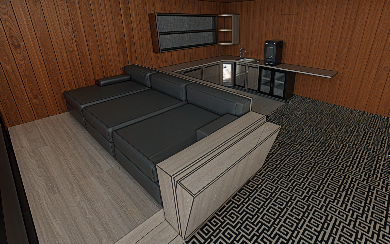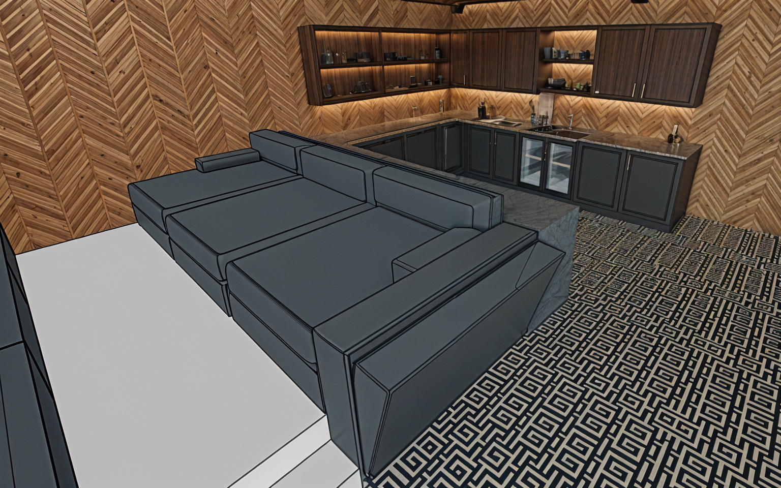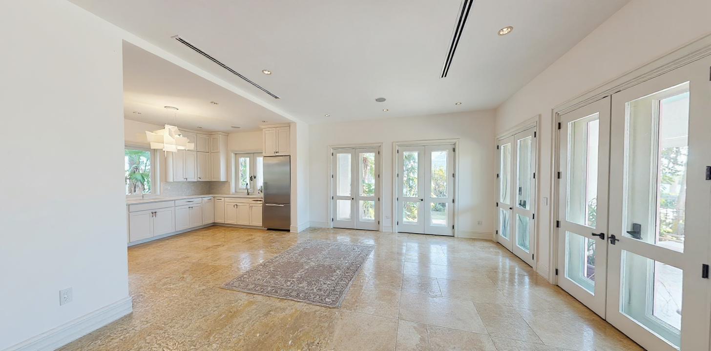 paint the walls in an off white color but not the kitchen cabinets remove all the art and the furniture specially the dining table with the rug and the chairs do not modify the characteristics of the stone flooring