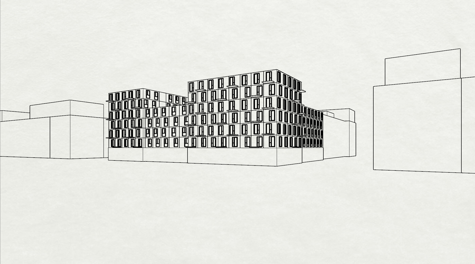 dark granite paint large openings for commercial space green tints of corrugated steel to upper facade change direction of corrugated steel per volume black windows light emitting add people inside and out