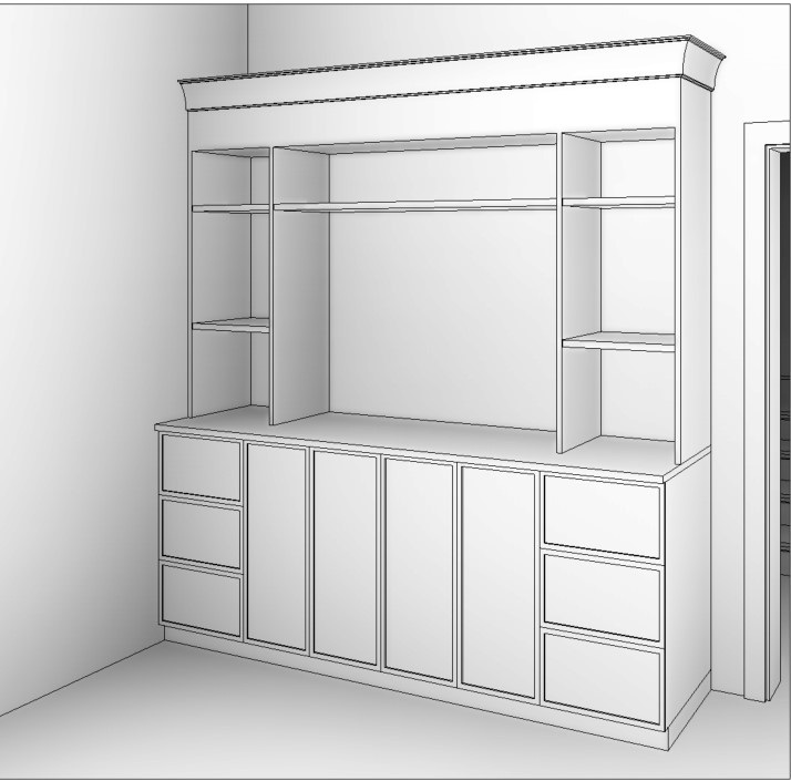 dark blue cabinets with brass hardware white oak floor white oak counter top wallpaper behind the shelves