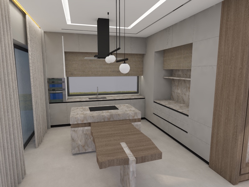 hidden lights under the upper boards make the white boards 9016 glossy and the brown above the sink wooden boards with 3d vertical lines keep the black details under the counter the counter must be glossy marble the floor is beige 60x120 matt tiles add decor and chairs remove the hidden light of the island