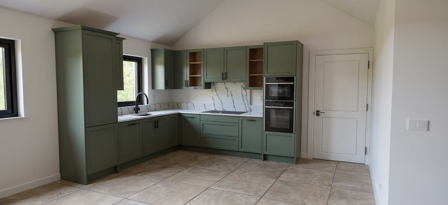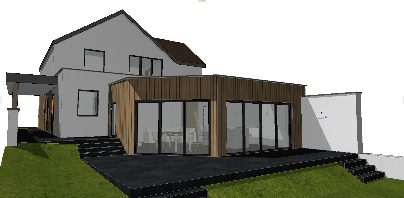 render a modern house with a sleek contemporary design the main structure should be composed of smooth gray walls and a dark gray sloped roof the extension features natural wood paneling with large glass doors and windows providing a seamless indoor outdoor experience the ground should be covered in lush vibrant green grass contrasting with stylish black stone steps and patio area the building is set within an urban area set the scene under a clear blue sky with warm soft lighting to create a serene and inviting atmosphere