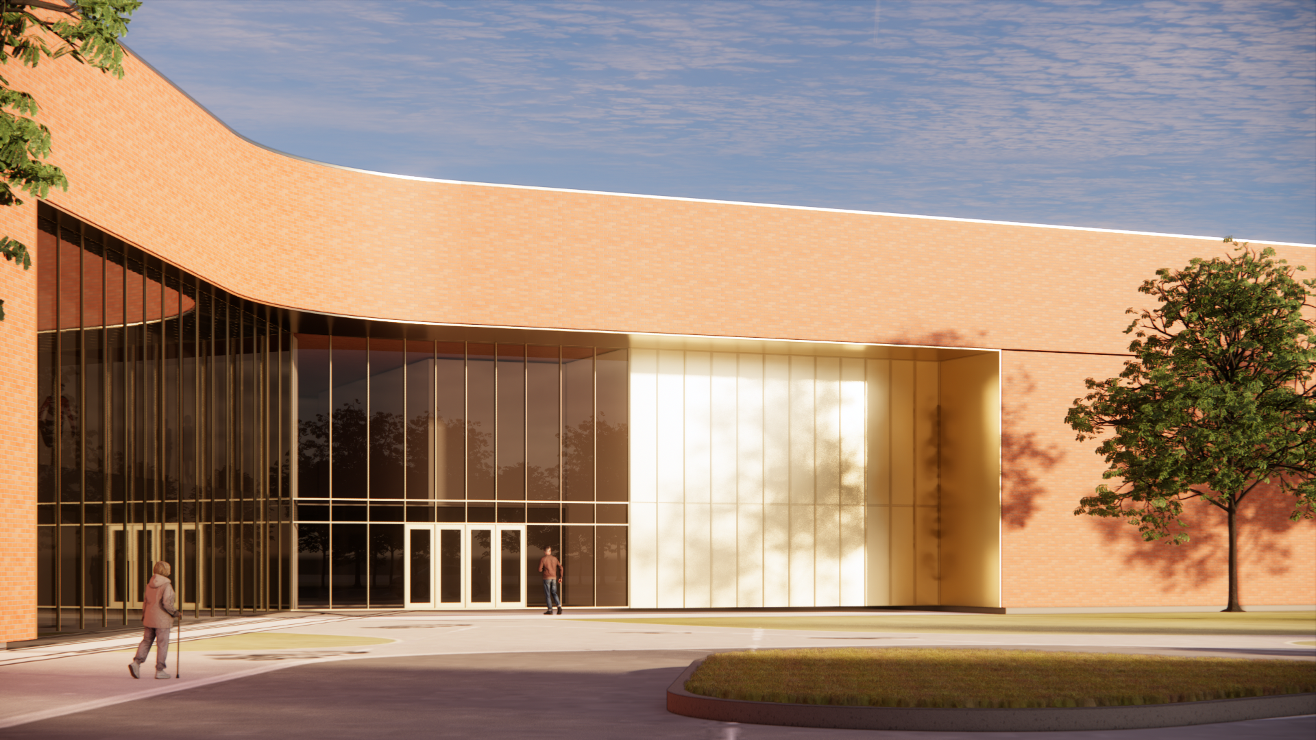 render a modern architectural scene with a building featuring smooth curved brick walls in a warm terracotta highlight large reflective glass windows casting subtle shadows include a clear blue sky with gentle clouds and lush green trees framing the scene their shadows creating patterns on the ground add a soft golden sunlight illuminating the area creating a serene and inviting atmosphere