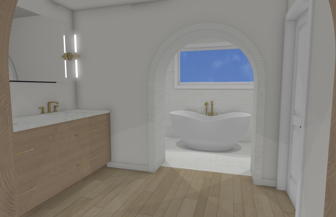bathroom with white oak flooring and cabinetry and white marble countertop a brass contemporary light fixture is to the right of the mirror through an arched doorway is a wet room containing marble flooring and a freestanding slipper bathtub a brass tub filler sits centered behind the tub windows above the bathtub show the upper limbs of trees and sky image is 8k and hyperrealistic