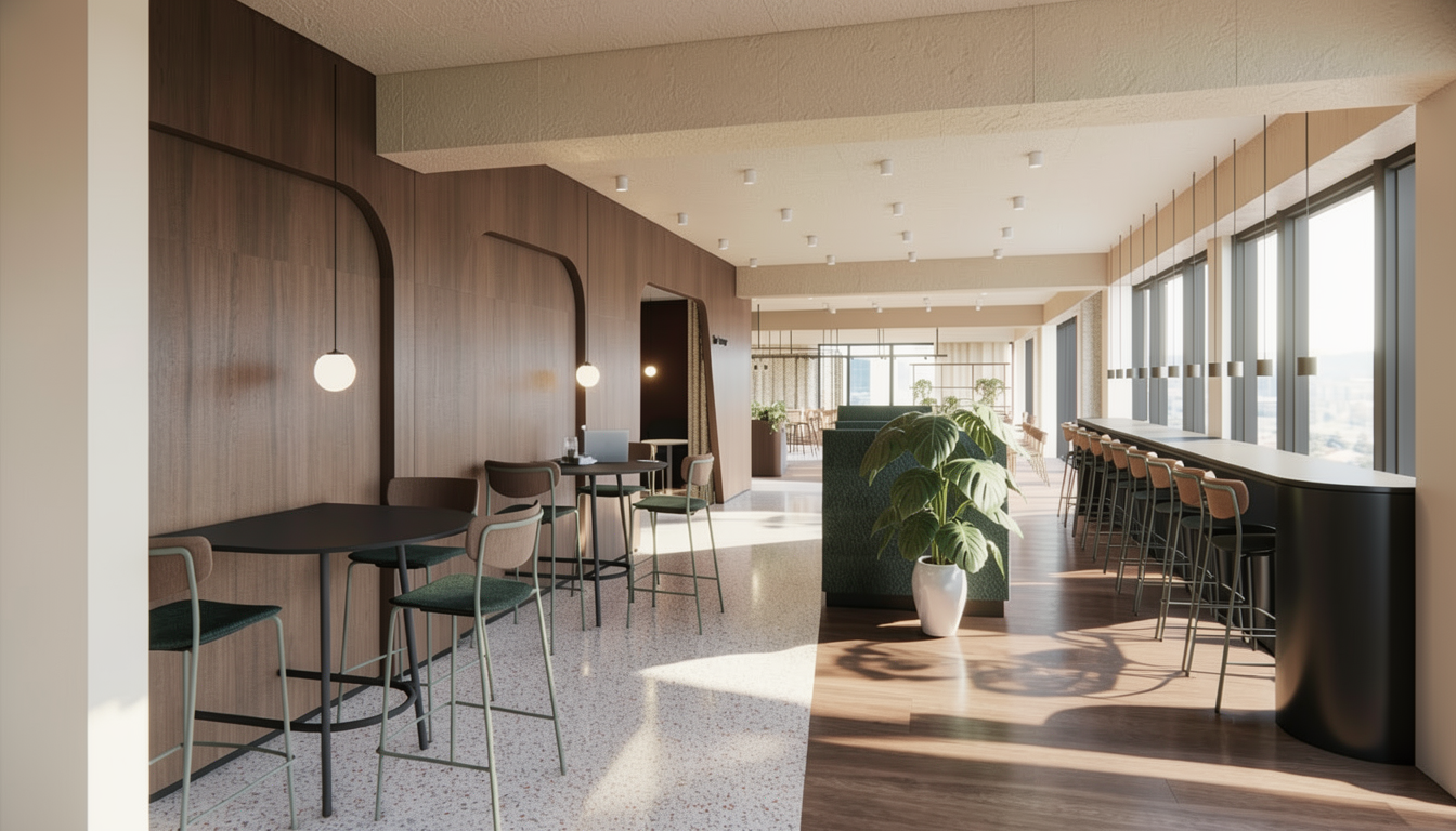 transform the provided meeting room interior image into a high end photorealistic render with a refined luxury hotel chic atmosphere warm elegant lighting and premium material realism while keeping everything exactly the same same geometry same proportions same furniture positions same ceiling layout same wall divisions and same spatial configuration do not move or alter any objects or architectural elements all tables and chairs must remain in their exact locations and proportions the chair legs should read as light oak wood with realistic grain and subtle satin finish the table bases should appear matte black metal and the table tops should read as clean white solid surface with soft reflections and crisp edges without changing shape or dimensions wall finishes and colors must remain exactly as designed wall paneling lambrisering and main walls in portland stone deep tone with realistic painted texture wallpaper in the niche should read as casamance serti with refined textile depth and subtle pattern realism inside the illuminated niche place a large elegant statement vase with a tasteful floral arrangement scaled correctly and integrated naturally without changing the niche geometry add subtle meeting styling on the tables a few premium notebooks pens and glass water carafes with drinking glasses minimal refined and evenly distributed without clutter and without changing table layouts lighting should be turned on throughout the space including ceiling fixtures and niche lighting creating warm ambient illumination soft shadows gentle highlights and a sophisticated hospitality atmosphere enhance realism through accurate wood grain fabric upholstery texture on chairs deep aubergine tone as shown stone paint surface depth and polished material reflections while preserving the entire original design exactly as provided