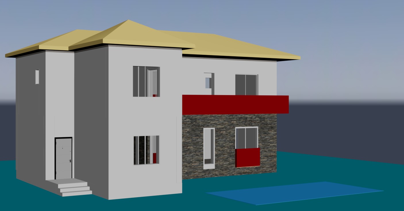 exterior shot the entire facade will be white apply the stone shown in the moodboard to the areas where the stone is visible the area i painted red will have white metal railings the facade windows will have electric white shutters add landscaping to the green area the pool will be in the blue area there will be stepping stones and ground lighting on the path leading to the entrance gate there will also be lighting on the facade wall make the render realistic and bright the stone detail should be on the ground floor on the right side the door will be on the left at the entrance and will be white the path leading to the entrance stairs should have stepping stones and ground lighting increase the landscape area and plants roof pitched roof stone ground floor right wall facade doors windows shutters white