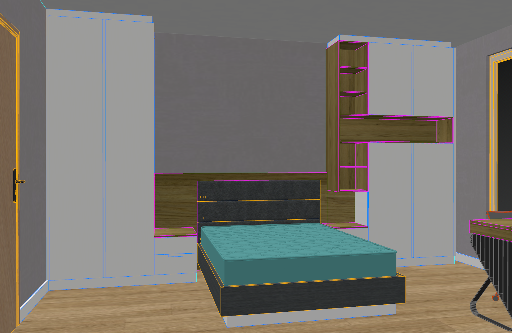 there should be spot lighting on the ceiling the wall behind the bed headboard should be painted gray the bed headboard should be made of charcoal fabric there should be bedding on the bed there should be a sea view at the window the areas with pink stripes should be wooden paneling the areas with blue stripes should be white the door models should remain the same a board displaying toy cars should be placed on the wall behind the bed headboard there should be spot lighting under the shelves there should be books on the shelves