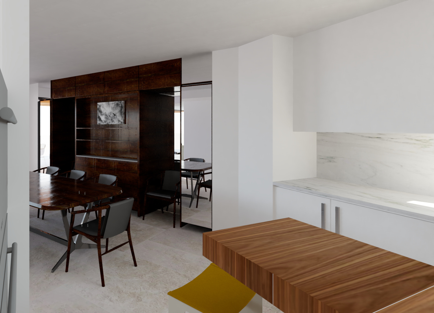 create a modern dining room and kitchen room featuring a spacious walnut table surrounded by elegant walnut chairs with black leather cushions the atmosphere is warm and inviting enhanced by rich walnut and glass cabinetry incorporate white walls and a light marble backsplash in the kitchen the kitchen cabinets are an ivory finish and color add a large window with black frames to allow natural light to flood in creating a bright airy feel the floor is light stone tile complementing the neutral palette