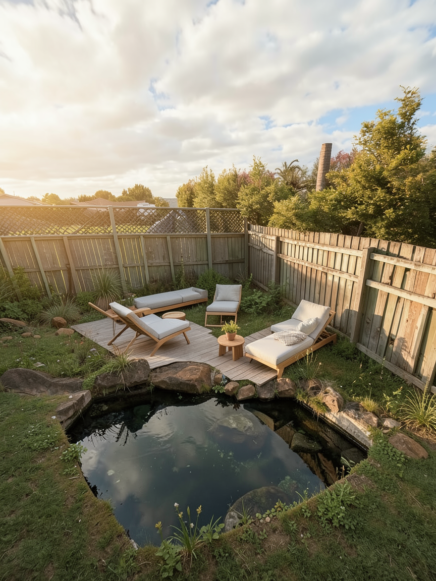 in the photo the left side of the deck will have retaining walls and the back yard will have a wall wrap around in a semi circle to kind of hide the lower level and in it will be a putting green with a large open area that is the whole backyard the garage door to the left of the photo will have a concrete driveway and the garage door will be a windowed garage door with all windows in black