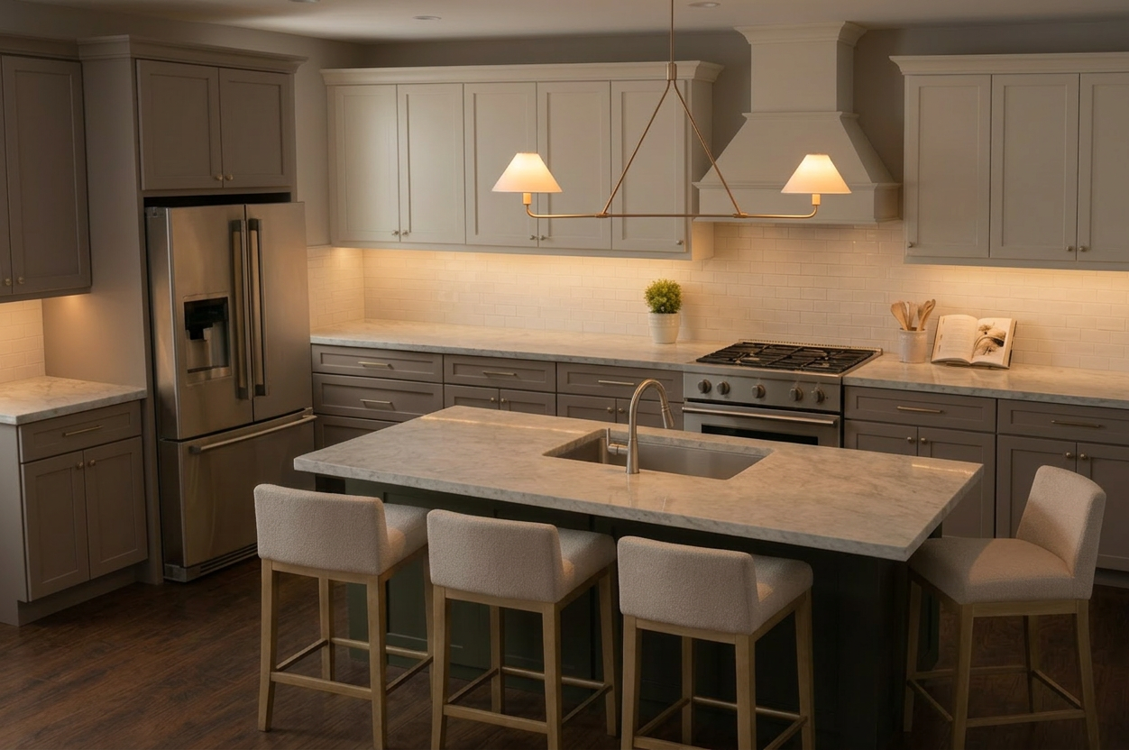 mettre un plancher de c ramique les armoires du bas couleur bois pale rajouter vier en dessous de la fenetre comptoir et une table 4 places en avant de la porte patio
