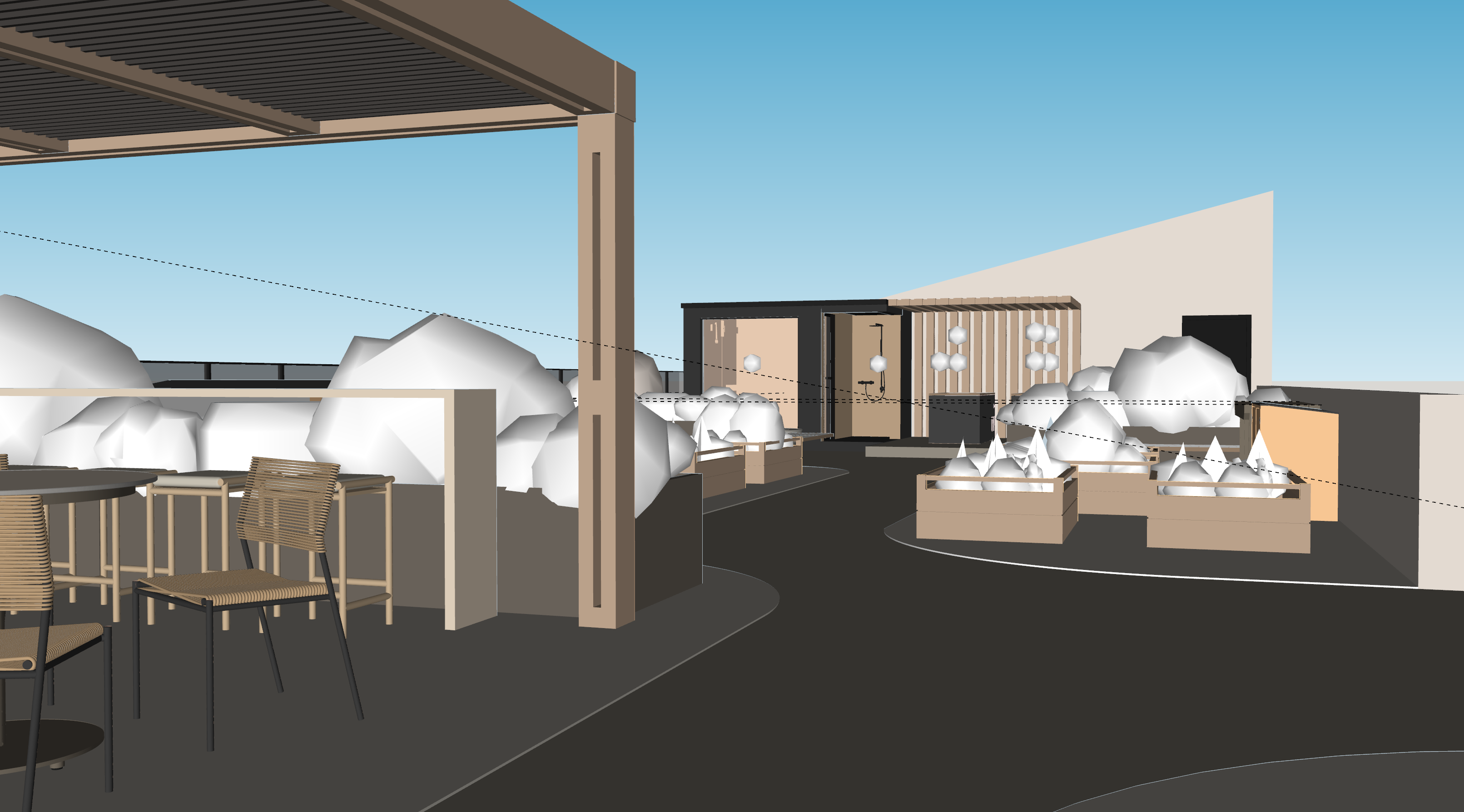 turn this sketchup model into a realistic rooftop render back left is a sauna and shower planters in the foreground dont add new foliage but make the white foliage look like real foliage