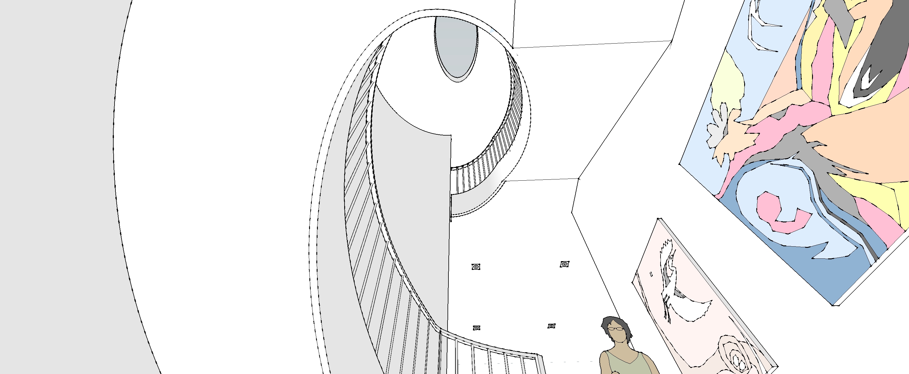 modern architectural home open airy ambience with natural light no cornices artwork to look painterly elliptical slylight in centre of image to look through to blue sky black steel handrail stair to have solid white coloured stringer
