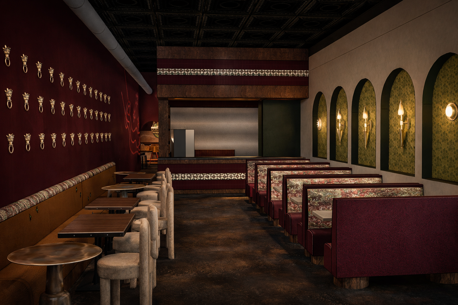 photorealistic upscale spanish inspired cocktail bar interior straight on perspective down a narrow restaurant aisle rich burgundy plaster wall on the left with evenly spaced polished brass bullhead wall hooks subtle metallic reflections and patina continuous upholstered banquette below in warm cognac leather with realistic grain texture and soft compression small walnut tables with natural wood variation matte finish and authentic edge wear cream boucle dining chairs with visible fabric fibers and soft shadows on the right side a row of deep burgundy velvet booths with realistic nap direction soft highlights and slight wrinkling above each booth are arched wall niches painted deep forest green with vintage spanish floral wallpaper inside subtle aging and texture brass sculptural wall sconces mounted within niches emitting warm ambient light 2700k soft glow on surrounding surfaces at the end of the space a dramatic bar clad in glossy deep red ceramic tile with subtle imperfections and reflections dark stained oak millwork with visible wood grain variation and satin finish black marble or dark stone bar top with soft reflections and edge highlights ceiling features black pressed tin panels with detailed embossing soft shadowing and realistic depth exposed silver hvac duct with brushed metal texture and accurate light reflection floor is dark polished concrete with natural variation subtle reflectivity micro scratches and soft light falloff lighting is cinematic and layered warm indirect lighting practical sconces soft ambient glow realistic shadow falloff global illumination ray traced reflections ambient occlusion physically accurate materials camera settings 35mm lens eye level perspective professional architectural photography sharp focus shallow depth of field falloff in distance balanced exposure realistic contrast rendering quality ultra photorealistic ray tracing global illumination physically based rendering pbr high dynamic range natural imperfections real world material accuracy architectural digest style photography 8k detail atmosphere warm intimate upscale spanish cocktail bar moody but inviting editorial quality luxury hospitality interior