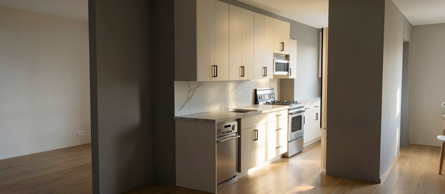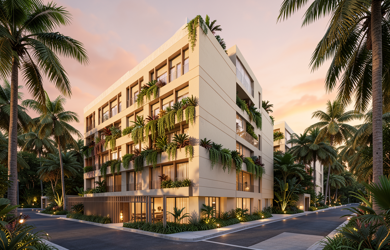 contemporary tropical residential complex identical to the reference image preserving the same composition perspective proportions and architectural layout modern low rise buildings with clean lines warm neutral materials large windows and integrated balconies surround the project with lush tropical vegetation including palm trees dense greenery and layered planting add abundant vegetation on balconies with tropical plants planters and cascading greenery integrated into the fa ade include a street in the foreground subtly integrated with the landscape with a clean modern design smooth pavement and minimal visual interruption to the architecture set the scene at sunset golden hour with warm soft light long shadows and a subtle orange pink sky add ambient landscape lighting along the pathway and soft interior glows from the buildings enhancing a calm and inviting atmosphere maintain realistic materials reflections and shadows ultra realistic architectural render 4k cinematic composition no people
