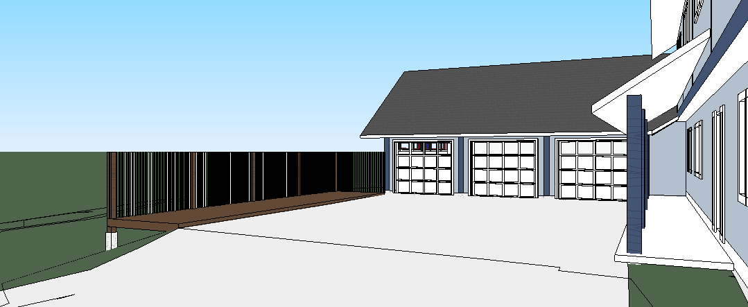 there is a residential road on the left with houses and willow trees the house has dark blue trim and light blue stucco add nice landscaping and surrounding trees