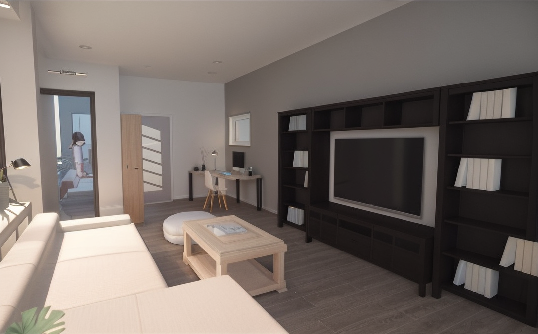 a wooden desk with a laptop keyboard and mouse on it a white chair is positioned in front of the desk a potted plant is placed nearby and a tv is mounted on the wall above the desk the room also features a window and a bookshelf with various books architecture