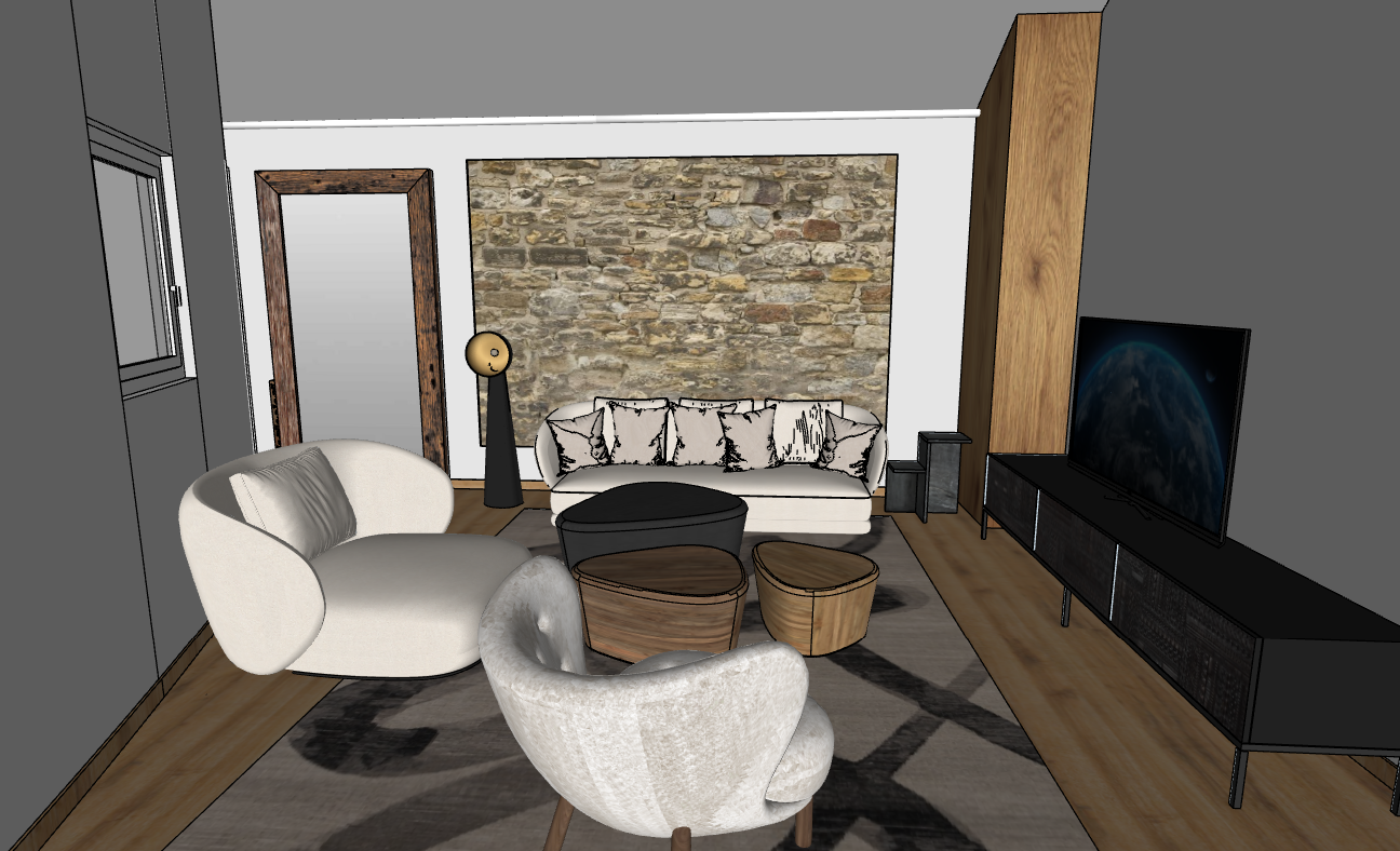 ilumina el contorno del muro de piedra agrega cortinas que vayan desde el piso hasta el techo en tonos muy claros con movimineto y forma natural conserva los mismos elementos que se muestran en la imagen original no cambies nada