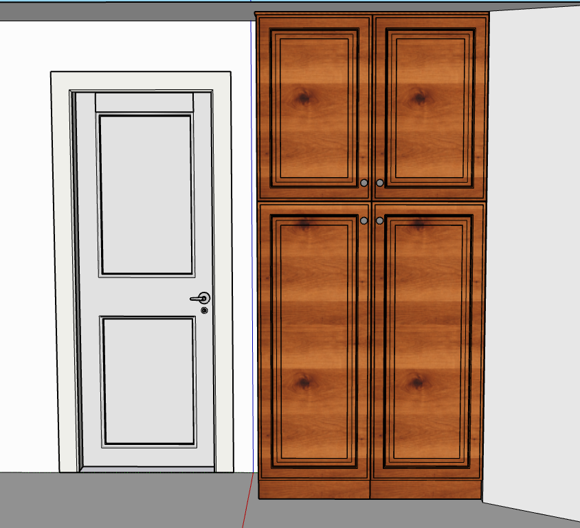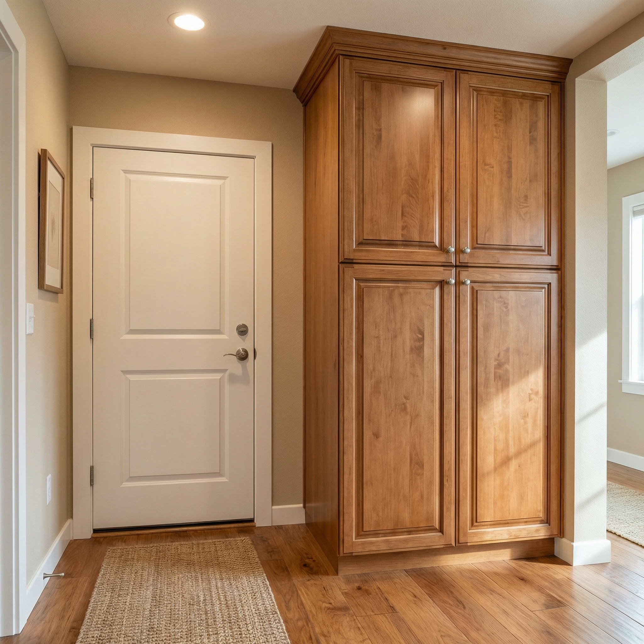 this is a linen closet in a hallway its made of a medium dark stained alder the cabinet goes all the way to the ceiling without any crown molding the cabinet doors all have brushed nickel knobs the hallway continues at an angle to the right and there is a doorway to the left