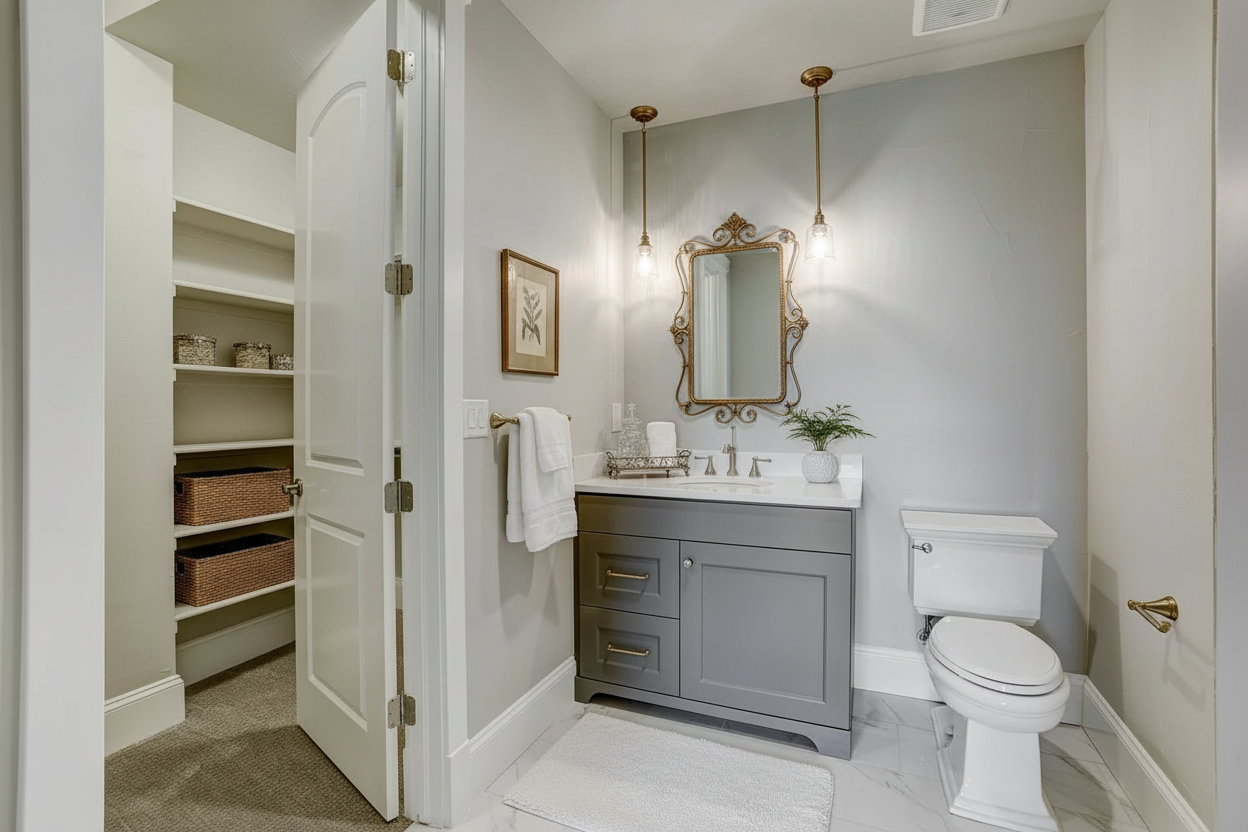 style this vanity add a mirror on the vanity wall add small decor to the countertop