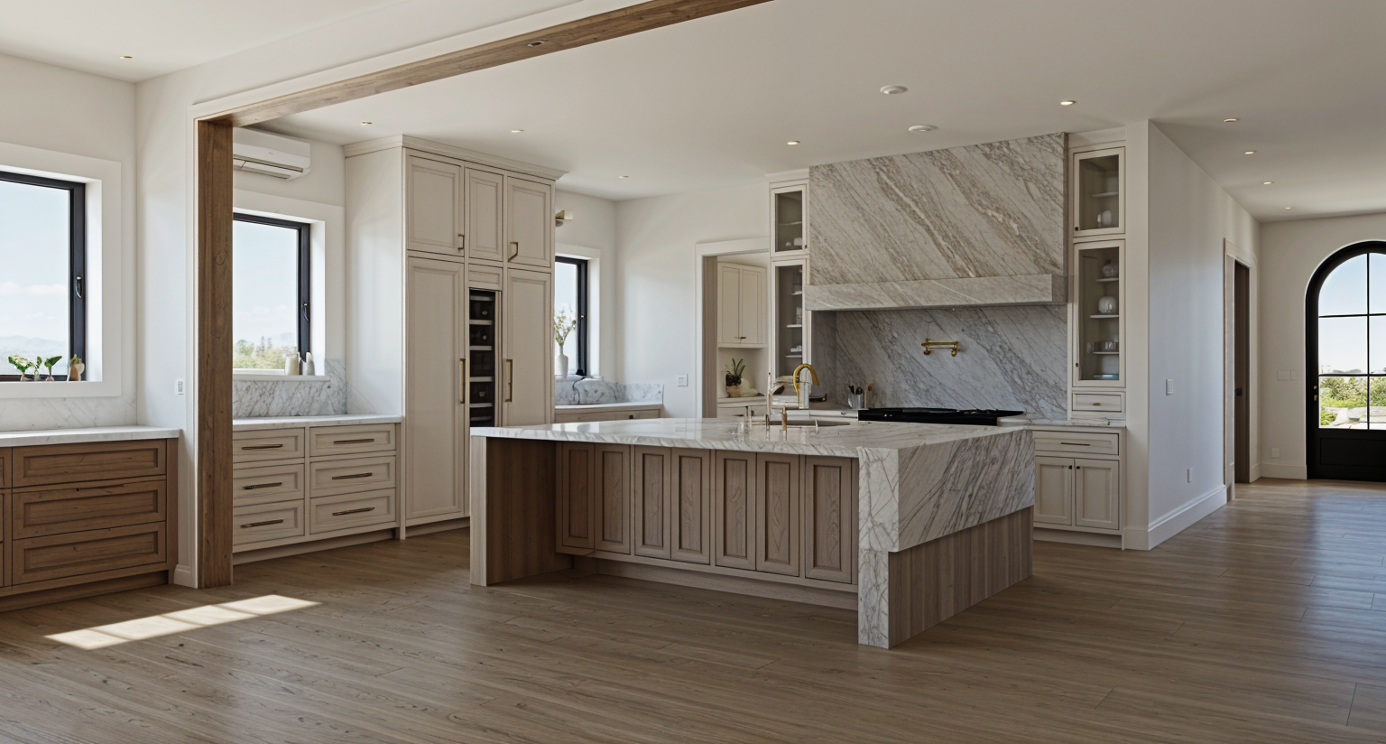 add modern patterned grey area rug add brick behind tv add liquor bottles to shelves add a folded blanket to end of couch add books to coffee table turn tv s on add accessories to countertop by tv