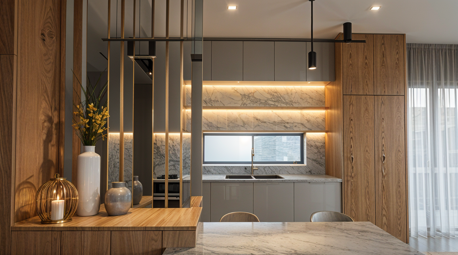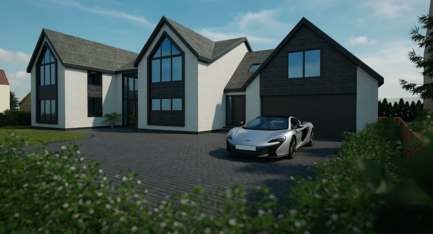 modern luxurious house with contemporary design and large windows featuring a striking dark blue sports car parked in the driveway dont change the car the house has a sleek grey and white exterior with textured slate stone elements the lush manicured greenery surrounds the paved driveway the sky is bright with soft fluffy clouds casting gentle shadows creating an inviting warm summer serene atmosphere include vibrant green foliage and rich blue skies to enhance the serene upscale ambiance