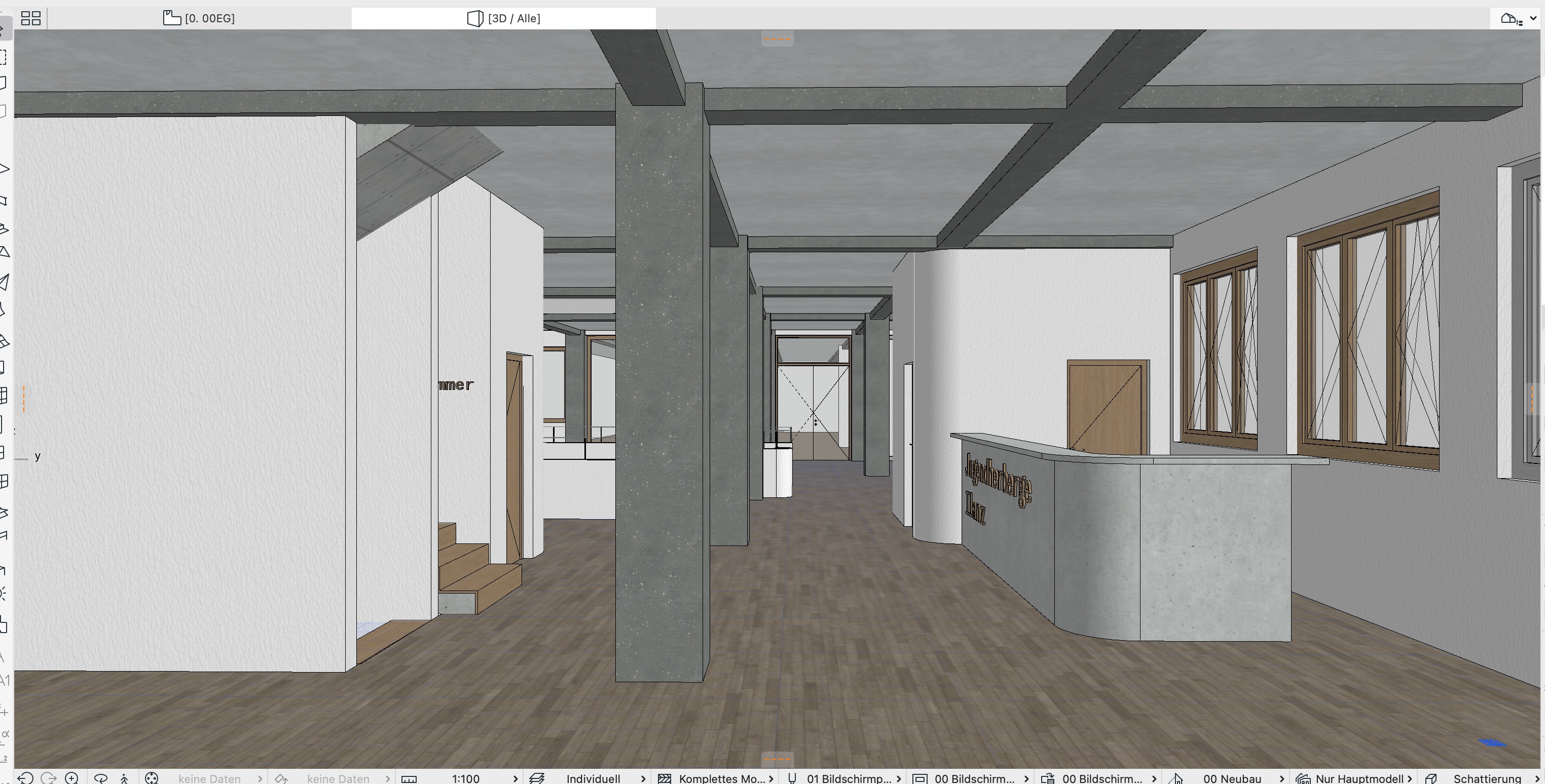 generate a fully photorealistic architectural interior photograph of jugendherberge ilanz the ground floor entrance lobby of a youth hostel in a renovated swiss building three images are uploaded each has a distinct role first image base composition your archicad design preview of the actual space treat it as a preliminary architect s sketch of the design intent use it strictly for the room geometry camera position perspective and basic spatial layout where the columns and beams sit where the reception desk is front right where the lounge corner is front left where the staircases descend left side where the windows are right side where the glass block skylight is above the stair area do not copy the rendering style your job is to produce the real magazine quality photograph of how this same space actually looks once built and finished second image material and photographic quality benchmark match exactly this level of material truth and photographic authenticity the board formed concrete brettschalung on the columns and beams must show the same depth warmth plank seams transferred wood grain tie rod holes soft warm grey tone and casting variation as the concrete in this reference the overall photographic quality soft naturalistic daylight calm atmosphere micro detail at every scale real architectural photography feel must reach the same level do not transfer specific objects from this image no round skylights no glass curtain wall no swimming pool no terrazzo flooring no terrazzo stairs material and photographic quality only third image furniture and interior styling reference take inspiration for the furniture style lighting fixtures plant arrangement color palette of furnishings and the casual lived in atmosphere specifically borrow light wood frame lounge chairs and armchairs soft upholstery in muted tones off white warm grey dusty sage soft blue warm pendant lamps abundant indoor plants monstera ficus smaller leafy plants in raw concrete or terracotta planters low solid wood coffee tables casual non staged arrangement do not transfer the wooden structural columns and beams the garlands or bunting the party decoration the pallet stacks the hand truck the fire extinguisher the caf bar or the industrial renovation elements your architectural structure stays purely exposed concrete and white plaster the space contents in roughly the same arrangement as the first image primary load bearing structure of round columns and rectangular ceiling beams in cast in situ exposed concrete with deep board formed surface brettschalung matching the concrete quality of the second reference image the structure must read clearly as concrete warm light grey with wood grain imprint not as wood smooth matte white plaster walls between and behind the concrete structure wide plank natural oak flooring with real plank seams knots grain variation gentle wear front right a curved cast pale concrete reception desk with the bronze toned engraved wordmark jugendherberge ilanz above the reception a cluster of five opal glass pendant lights at varied heights on slim black textile cables warm 2700k glow across the entire ceiling a black surface mounted track spotlight system one continuous track per beam slim minimalist matte black spotlights spaced along front left a casual lounge corner styled after the third reference image light oak frame lounge chairs and one armchair in soft sage textile around a low oak coffee table with books and a ceramic vase wool rug in oat tones underneath two large potted plants nearby in raw concrete or terracotta planters left side two staircases descending the first fully visible with light oak treads and slim oak handrail the second only as a half height oak balustrade above the stair area a ceiling skylight made of cast glass blocks glasbausteine classic 19x19cm grid shedding filtered geometric daylight onto the stair zone right side tall windows with slim oak frames atmosphere fresh summer morning around 9 am warm directional sunlight enters from the left side of the scene south east behind camera left grazing the concrete columns and casting long soft warm shadows across the oak floor that point to the right the right window band faces north and brings only cool silvery soft diffuse daylight no warm direct sun on the right side subtle morning haze with a few dust particles drifting in the sunbeams calm peaceful empty mood no people in the scene at all the space is captured in a quiet moment without any visitors staff or human figures absolutely no person no silhouette no body no figure anywhere in the image photographic spec shot on a hasselblad h6d 100c medium format camera 24mm tilt shift lens iso 200 f 8 1 125 sec daylight white balance around 5200k color science of kodak portra 400 subtle medium format film grain honest dynamic range preserve highlight detail in the windows and shadow detail in the beam undersides faint chromatic aberration only on the brightest highlights real micro contrast soft natural vignetting at frame edges the output must look like an authentic architectural photograph published in detail wallpaper el croquis or ad not like a rendering not like ai generated content you have full creative freedom to push every material surface texture light interaction and atmospheric subtlety into authentic photographic territory at the level of the second reference image introduce small honest imperfections a slightly rotated chair a creased rug edge a used coffee mug a plant leaning toward the light a small notebook on the reception counter anything that helps the scene read as a real lived in space rather than a staged showroom strictly forbidden no people no human figures no silhouettes no bodies in the entire image the scene must be completely unpopulated do not import objects from the second reference no round skylights no curtain wall no swimming pool no terrazzo do not import objects from the third reference no wooden structural columns or beams no garlands or bu
