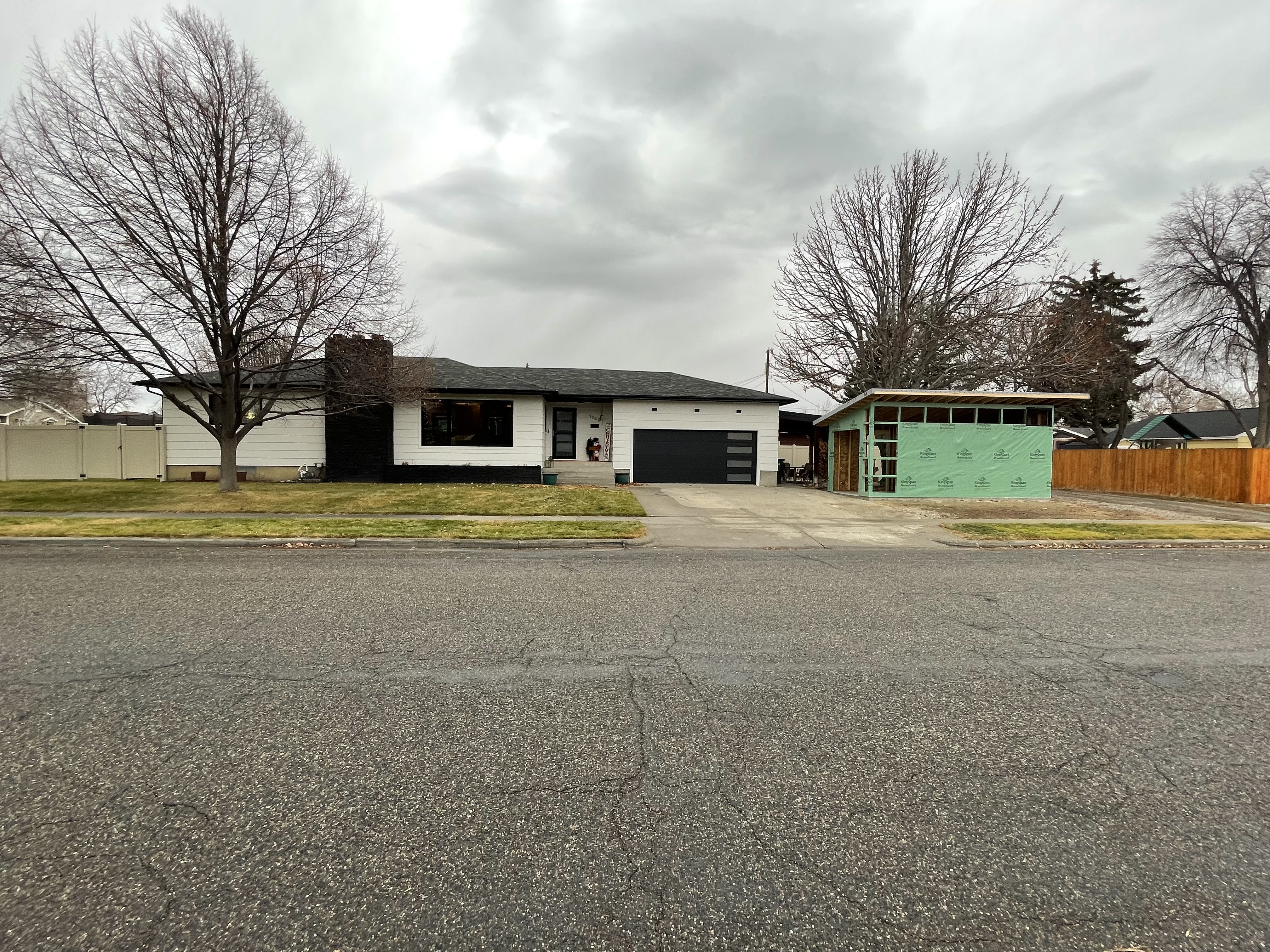 put white siding on shed a black garage door on the shed a black roof and soffit some nice landscaping with flowers make it a sunny day