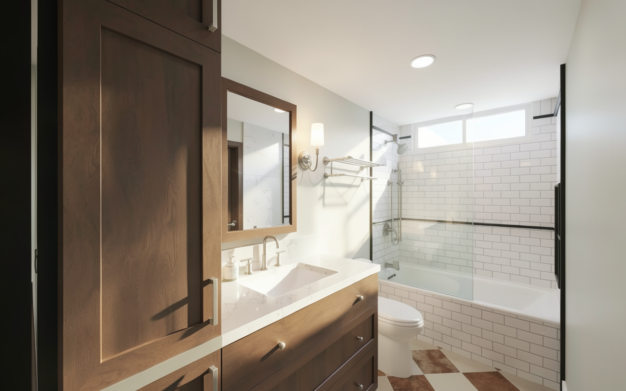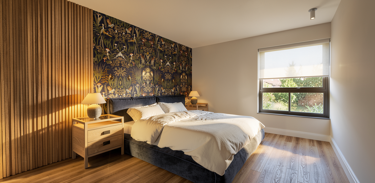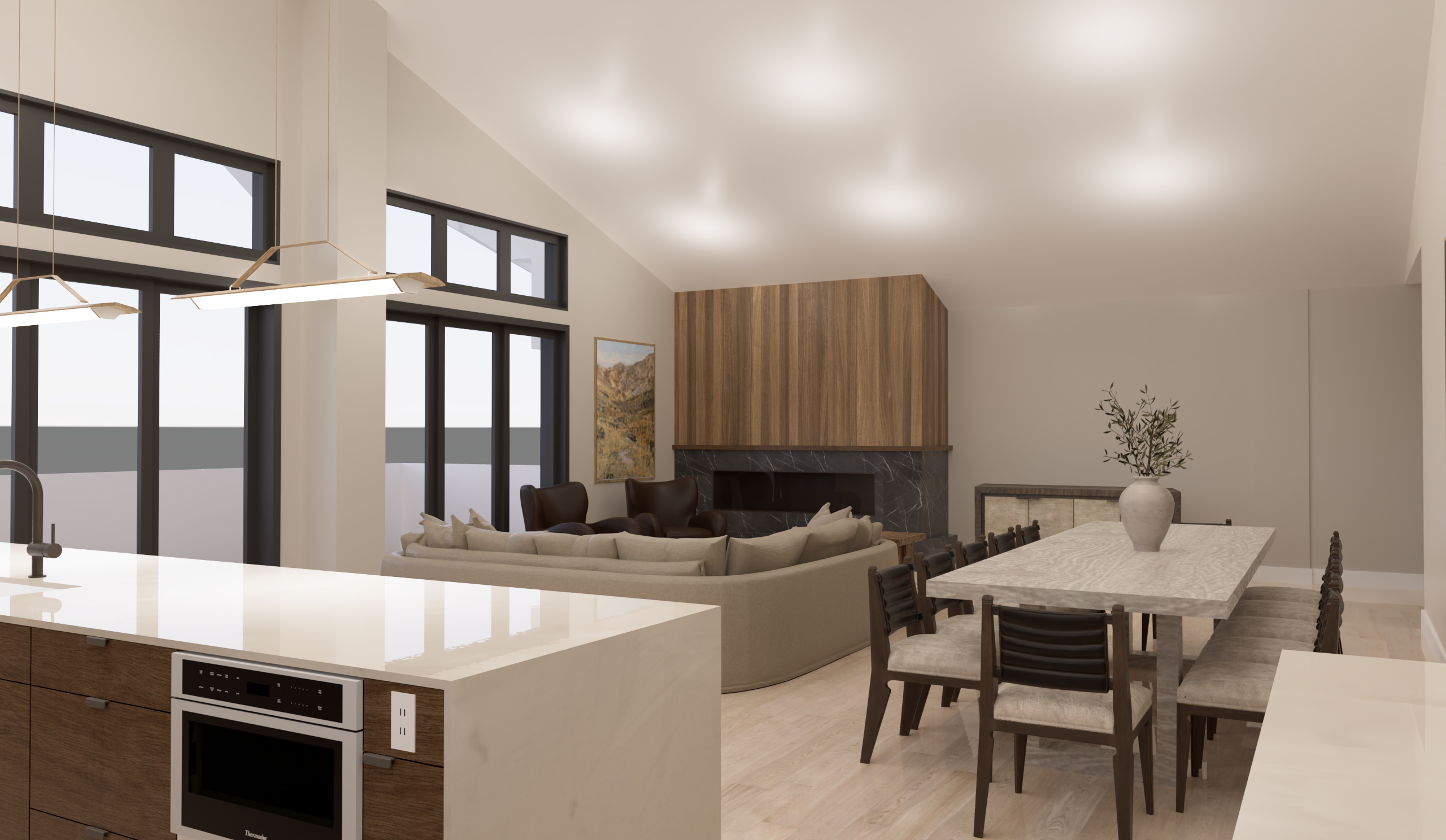 use the uploaded rendering as the exact base image and preserve all architectural elements finishes and furnishings without alteration maintain the same layout proportions materials and design intent do not modify walls ceiling details flooring millwork or furniture placement enhance the image into a highly photo realistic scene with accurate materials refined textures and natural depth improve realism through physically accurate lighting soft shadows reflections and material definition wood grain fabric stone and metal finishes set the lighting to golden hour with warm directional sunlight entering the space create a soft glow with long shadows and a warm inviting ambiance while maintaining balanced interior exposure through the sliding doors replace the exterior with a realistic view of breckenridge colorado featuring alpine mountain scenery with evergreen trees and natural terrain ensure the landscape feels geographically accurate and seamlessly integrated with the lighting conditions add an exterior deck directly outside the sliding doors with clean modern black railings the deck should feel cohesive with the architecture and properly scaled to the space ensure reflections light spill and perspective between interior and exterior are consistent and believable final output should appear as a professional architectural photograph not a rendering highlights and balanced interior exposure the final image should feel like a real high end residential photograph with no distortion or redesign of the original space make the two accent chairs by the fireplace olive green velvet