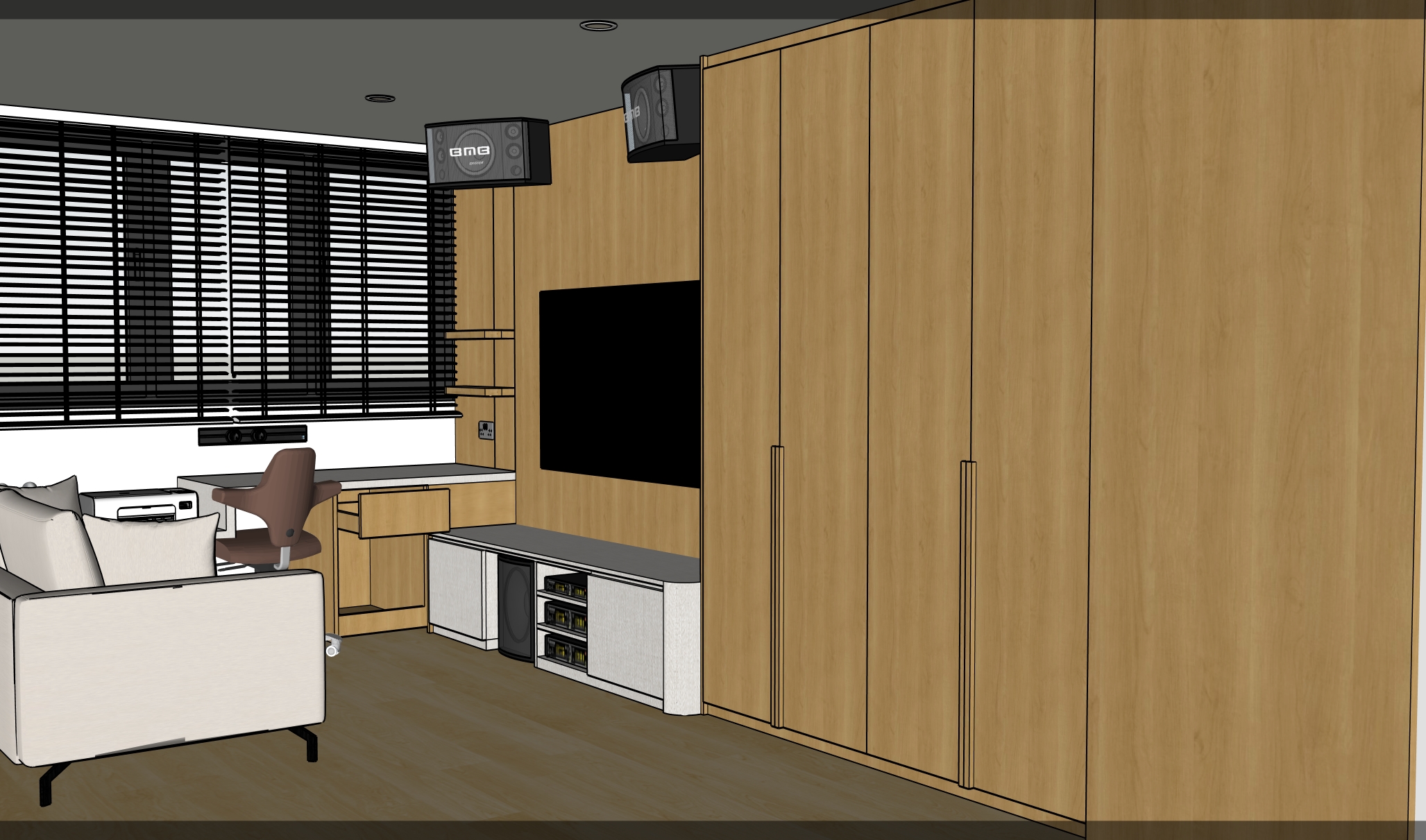 colours and wood texture less grains to remain accurate as per given picture blinds in off white tv console and top in like fabric off white study table top in like fabric off white full height cabinet door handle protrude out by 20mm ceiling in off white floor in wood vinyl subtle grains