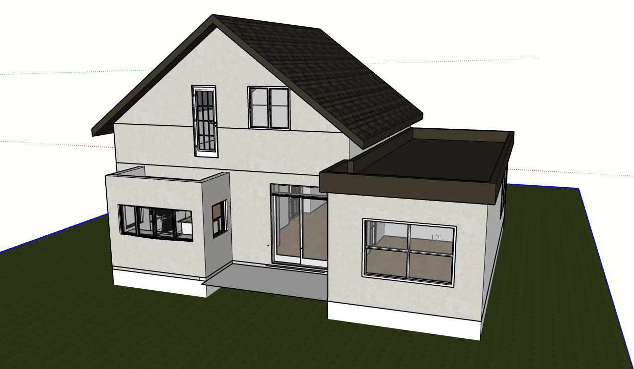 zaha hadid exterior shot can you suggest a roof design for the left hand side above this roof there will be a balcony where the patio door is located there will also need to be a roof the roof on the right and the one on the left need to be joined together harmoniously architecture