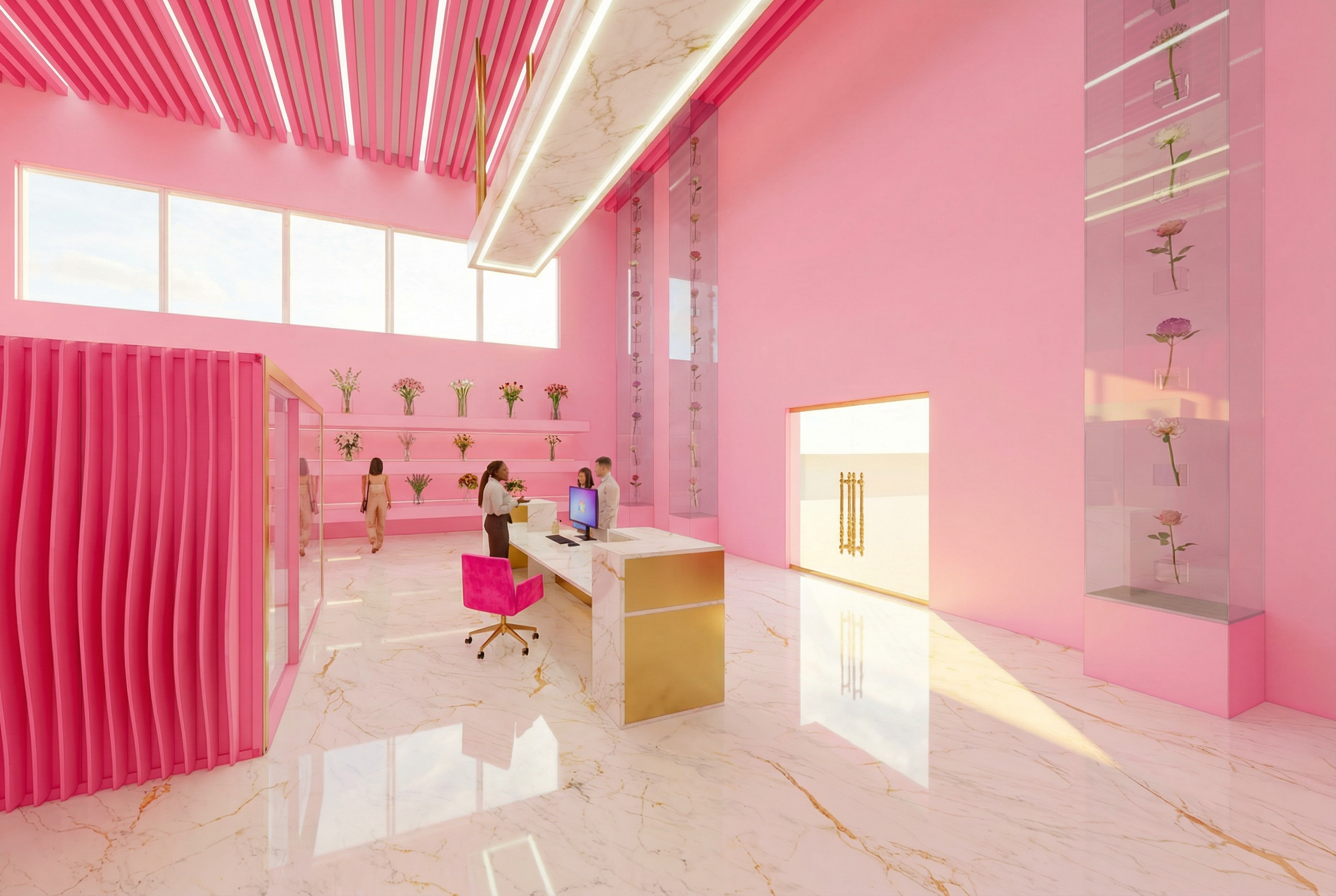 the floors are a white marble with gold veining the counter is a gold metallic with white marble countertop and inside the chair is gold metallic legs with bright hot pink velvet seat the display cabinet has a 3d patterned side that sticks out the walls are a light bright pink the light hanging down is white marble with gold veining it hangs down by metallic gold poles it has a led light in it to brighten the counter space below the ceiling is a bright hot pink slats with white led lights in between every single pink slat the 3 light bright pink shelves in the back have clear vases on every shelf with different types of flowers in each each shelf should have vases with flowers in them each vase has different flowers the door is clear glass with gold metallic handles the 3 clear display cases on the front wall the go to the ceiling have single flowers floating in a stacked position all the wall up to the ceiling the lighting should be bright and daylight but showcase the flowers well the look is luxury maintain the exact same perspective view as the original picture include the people as shown in the original picture the windows show a view of clouds and some buildings the quality of the materials and people need to be realistic and not blurry