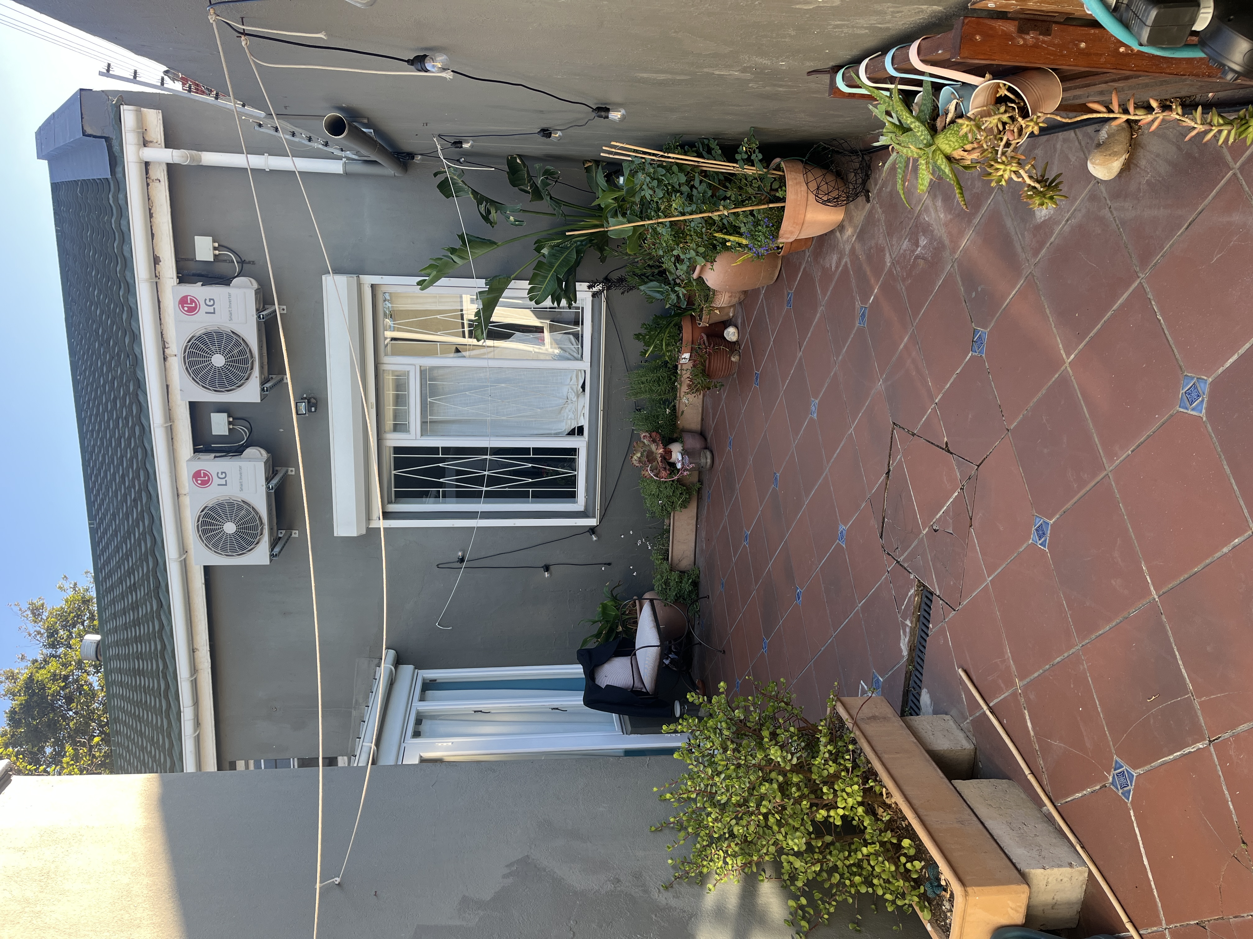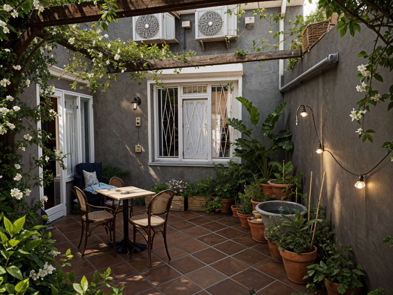 mediterranean courtyard with a half circular fountain against the wall and lot of plants and a wooden pergola covering the courtyard vine and jasmin plants are groing along the wall and the pergola bistro table with two chairs klompie pavers in creme flooring