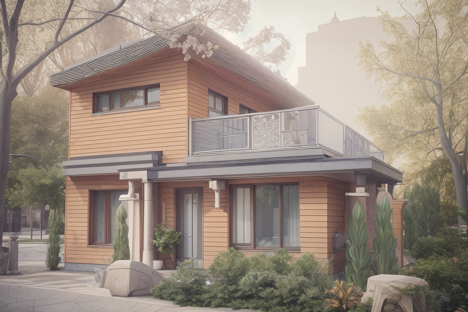 modernist exterior shot make the roof sloped all along the roof line and colour it a slightly glossy black architecture
