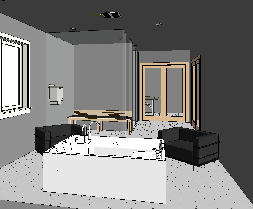 large bathroom spa floor is light color tile walls are large pale tan tile the window to the left has a palm tree just outside of it