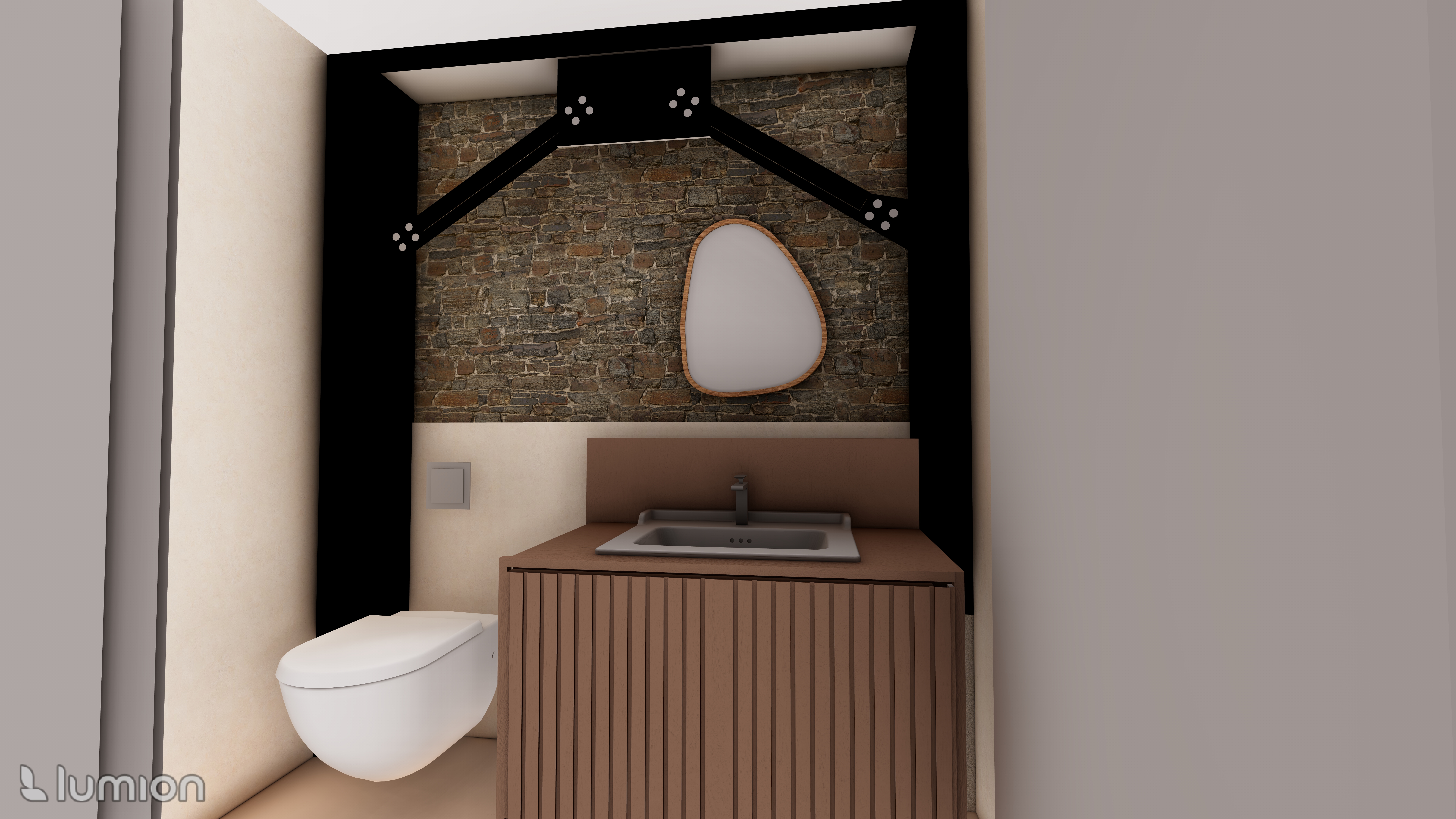 interior shot a small modern bathroom with a minimalist design the walls are soothing beige with a textured stone accent behind a uniquely shaped mirror the vanity is a rich natural wood tone complemented by a sleek wite sink the toilet is a pristine white seamlessly integrated into the space the atmosphere is warm and inviting with soft lighting that highlights the earthy colors and textures creating a cozy and sophisticated ambiance architecture